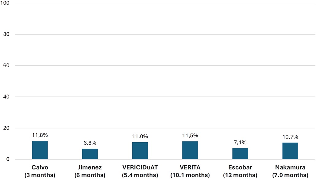 Figure 7. Discontinuation rates in RWE studies. RWE, real-world evidence, (follow-up). Figure based on data from references (19, 20, 22–24, 30).