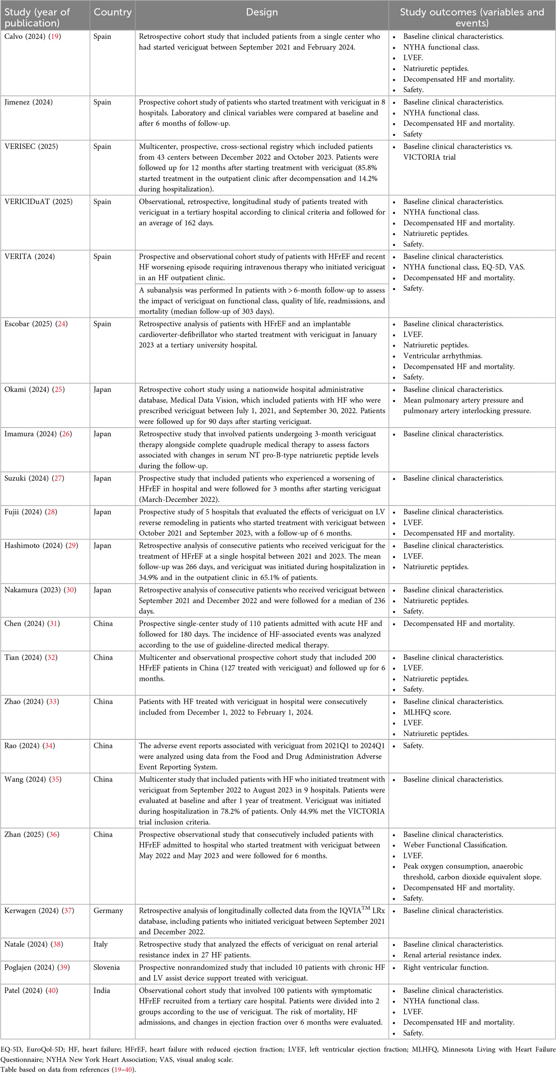 Most of the RWE studies provided baseline clinical characteristics, including HF treatments, as well as the VICTORIA baseline characteristics (vericiguat arm) (10, 19–30, 32, 33, 35–38, 40). Changes in quality of life and functional class after treatment with vericiguat were analyzed in the VICTORIA trial and in 7 RWE studies (10, 17, 19, 20, 22, 23, 33, 36, 40). The evolution of hospitalizations for HF and mortality after treatment with vericiguat were analyzed in the VICTORIA trial and in 9 RWE studies (10, 19, 20, 22–24, 28, 31, 36, 40). Changes in heart structure and function were assessed in the VICTORIA trial and in 9 RWE studies during treatment with vericiguat (18, 19, 24, 28, 29, 32, 33, 36, 39, 40). The evolution of natriuretic peptides (BNP or NT-proBNP) with vericiguat was reported in 7 RWE studies (19, 22, 24, 29, 30, 32, 33). Furthermore, changes in HF treatments after the start of vericiguat were specifically analyzed in 3 RWE studies (23, 25, 37), as were potential benefits with vericiguat (19, 22, 24, 27, 36, 38).