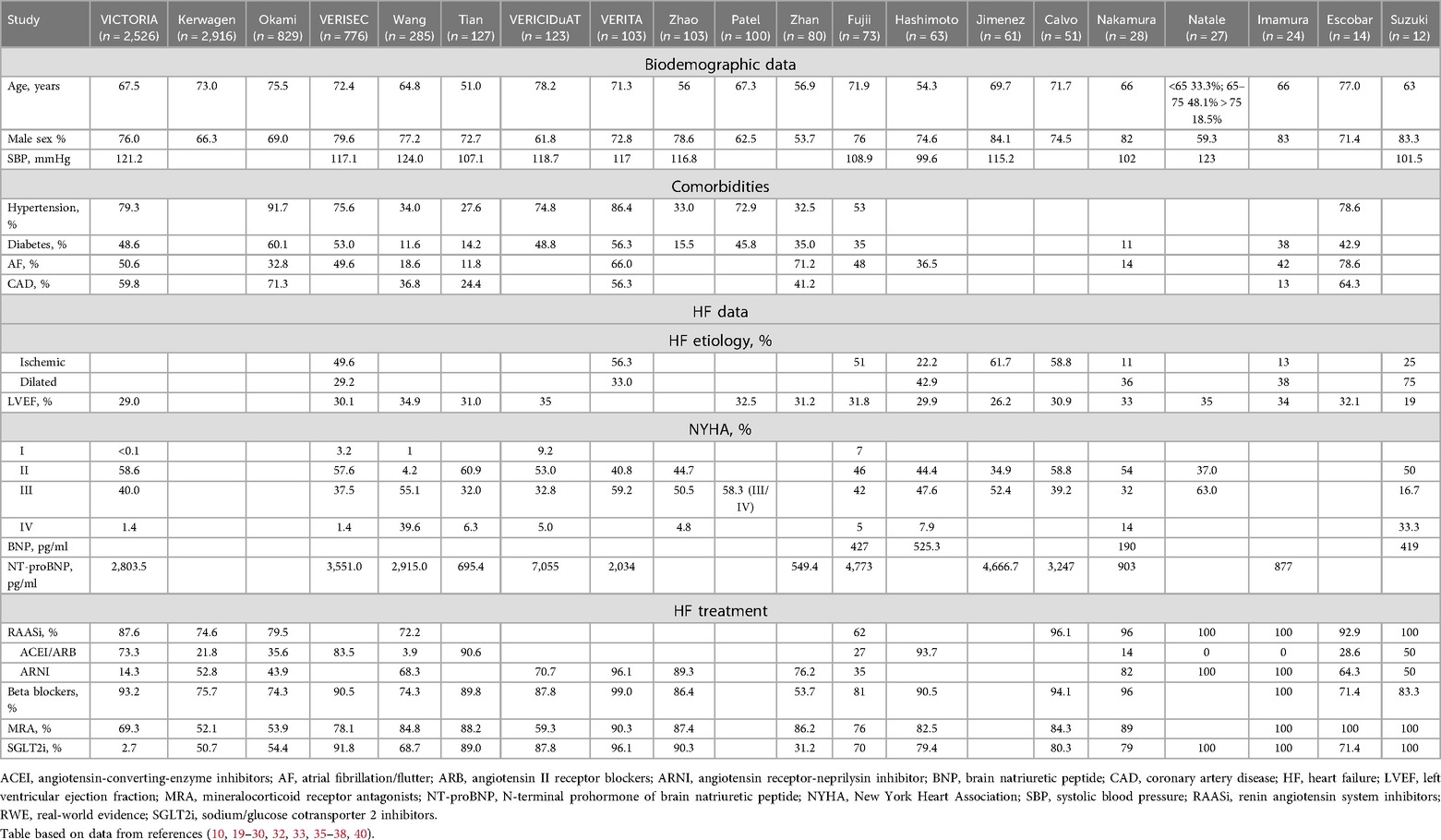 Regarding the baseline clinical characteristics in the VICTORIA trial (2,526 patients treated with vericiguat), mean age was 67.3 years, 76.1% were men, mean systolic blood pressure was 121.2 mmHg, mean LVEF was 28.9%, and median NT-proBNP was 2,816 pg/ml. NYHA functional classes II and III were recorded in 59.0% and 39.7% of patients, respectively. Therapy was with RAAS inhibitors in 87.9% (14.5% ARNI), beta blockers in 93.1%, MRA in 70.3%, and SGLT2i in only 2.7%. In the RWE studies, the number of patients included varied widely, from 12 to 2,916. Age ranged from 51.0 to 78.2 years, the percentage of men from 53.7% to 84.1%, mean systolic blood pressure from 99.6 to 124.0 mmHg, LVEF from 19% to 35%, and NT-proBNP from 549.4 to 7,055 pg/ml. In all the studies, most patients had NYHA functional class II or III, although the distribution was heterogeneous. In general, the proportion of patients treated with GDMT was high (Table 2) (10, 19–30, 32, 33, 35–38, 40).