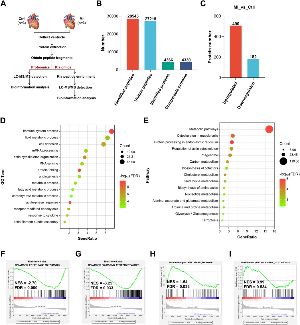 Figure 1. Proteomic analysis revealed metabolic reprogramming in post-MI hearts. (A) Schematic representation of proteomics and Kla omics. (B) Summary of identified peptides, unique peptides, identified proteins and comparable proteins. (C) Summary of differentially expressed proteins post-MI. (D) GO enrichment analysis of all the differentially expressed proteins. (E) KEGG pathway analysis of all the differentially expressed proteins. (F–I) GSEA showed the downregulation of genes involved in fatty acid metabolism and oxidative phosphorylation, together with upregulation of genes involved in hypoxia and glycolysis post-MI (relative to the control group). Kla, lysine L-lactylation; NES, normalized enrichment score; GO, gene ontology; KEGG, Kyoto encyclopedia of genes and genomes; GSEA, gene set enrichment analysis; FDR, false discovery rate.
