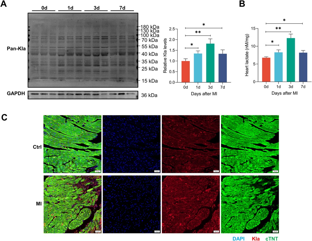 Myocardial infarction (MI), a common condition caused by prolonged ischemia of coronary arteries, remains a leading cause of death worldwide. Coronary occlusion significantly reduces the oxygen supply to cardiac cells, resulting in decreased oxidative phosphorylation and an enhanced glycolytic rate (1, 2). This metabolic shift leads to increased lactate production, aligning with both clinical and animal studies that have reported elevated circulating lactate levels after MI (3, 4). Lactate is far more than a mere byproduct of glycolysis. Beyond serving as a vital energy source for cardiomyocytes, it also plays crucial roles in maintaining homeostasis and supporting various physiological functions (5). What is even more remarkable is that lactate can act as a substrate for epigenetic modifications, thereby influencing gene transcription and protein function (6). Protein lysine L-lactylation (Kla), or called lactylation, is a recently discovered type of protein posttranslational modification (PTM) (7). Induced by L-lactate, lactylation is associated with hypoxia and the Warburg effect, participating in a range of physiological and pathological processes, including development, cancer, and cardiovascular diseases (6, 8). It has been reported that lactylation of Snail1 can promote cardiac endothelial-to-mesenchymal transition (EndoMT) and worsen cardiac fibrosis after MI (4). On the contrary, another study revealed that lactate and lactylation play a beneficial role in cardiac repair after MI, as Histone H3 K18 lactylation (H3K18la) in monocytes promotes the expression of cardiac repair genes, such as Lrg1, Vegf-a and IL-10 (9). Therefore, the relationship between lactylation and MI has not yet been fully elucidated. Understanding the status of protein lactylation before and after cardiac injury may hold great potential for the treatment of MI.
