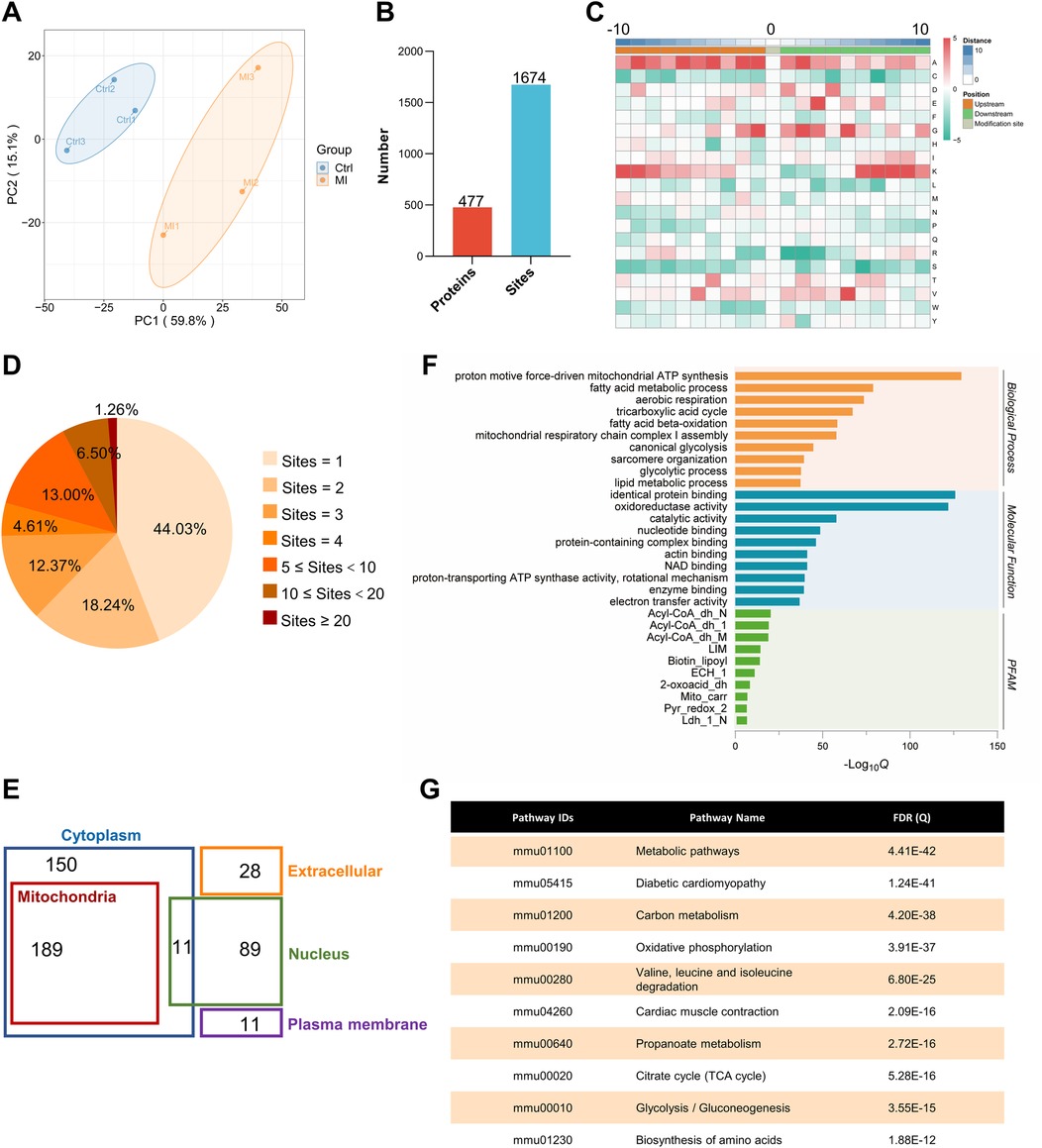 Figure 3. Identification and functional analysis of Kla sites in healthy heart. (A) PCA with a scatterplot of the first (PC1) and second (PC2) principal components was shown (n = 3 per group). (B) Summary of identified lactylated proteins and lactylation sites. (C) The frequency of amino acids surrounding lactylated lysines was analyzed, with 10 amino acids taken upstream (−10 on the x-axis) and 10 amino acids taken downstream (+10 on the x-axis), and the target lysine itself positioned at 0 on the x-axis. (D) Distribution of the number of lactylation sites per protein. (E) Cellular compartment distribution of 477 quantified lactylated proteins in our dataset predicted by Wolf PSORT. (F) The bar graphs showed representative ontology annotations enriched in the lactylated proteome. (G) KEGG pathway analysis of all the identified lactylated proteins. PCA, principal component analysis.