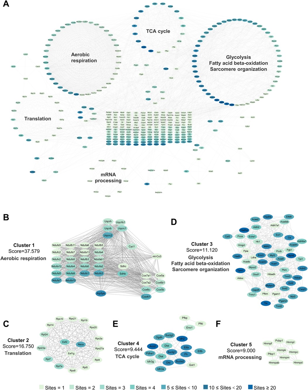 Figure 4. Interaction network of lactylated proteins in healthy heart. (A) PPI network on the basis of the STRING database (v12.0) and visualized in Cytoscape. (B–F) The highly connected five clusters were defined by MCODE and displayed using Cytoscape, including Aerobic respiration (B), Translation (C), Glycolysis, fatty acid beta-oxidation and sarcomere organization (D), TCA cycle (E) and mRNA processing (F) PPI, protein-protein interaction; MCODE, molecular complex detection.