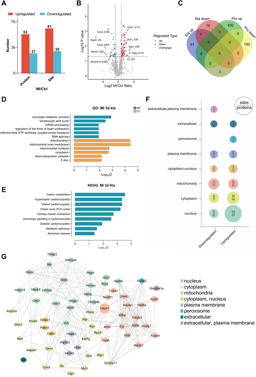 Figure 5. Proteomic profiling of changed Kla sites following MI. (A) Numbers of Kla sites and proteins exhibiting remarkable different Kla levels following MI. (B) Volcano plot visually displayed the number and fold-change distribution of altered Kla sites. (C) Venn diagram showing the relationship between proteins exhibiting remarkable Kla changes and proteins exhibiting remarkable changes in contents. (D–E) GO enrichment analysis (D) and KEGG pathway analysis (E) of proteins containing altered Kla sites. (F) Cellular compartment distribution of differentially expressed Kla sites (numbers above the line) and lactylated proteins (numbers below the line). (G) PPI network diagram of proteins exhibiting remarkable Kla changes on day 3 post MI.