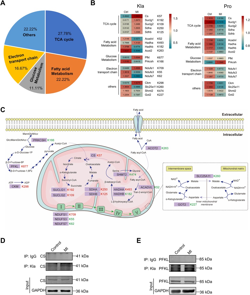 Figure 6. Kla changes of metabolism enzymes following MI. (A) Functional distribution of metabolism enzymes showing significant Kla changes post-MI. (B) Heatmap showing Kla changes (left) and protein-content changes (right) in metabolism enzymes on day 3 post MI. (C) Overview of metabolic pathways, with altered Kla sites in the infarcted heart indicated in comparison to control hearts (red represents upregulation, and green represents downregulation). (D–E) The Kla abundance of selected proteins (CS and PFKL) detected by immunoprecipitation and western blotting.