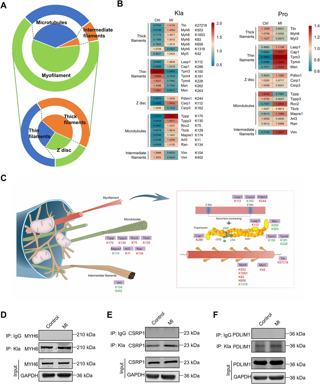 Figure 7. Kla changes of cytoskeletal proteins following MI. (A) Functional distribution of cytoskeletal proteins showing significant Kla changes post-MI. The lower part of the figure indicates subgroups of myofilament proteins. (B) Heatmap showing Kla changes (left) and protein-content changes (right) in cytoskeletal proteins on day 3 post MI. (C) Schematic diagram demonstrating significant differential Kla changes in cytoskeletal proteins post-MI (Red indicates a significant increase in Kla, while green indicates a significant decrease in Kla). (D–F) The Kla abundance of selected proteins (MYH6, CSRP1 and PDLIM1) detected by immunoprecipitation and western blotting.