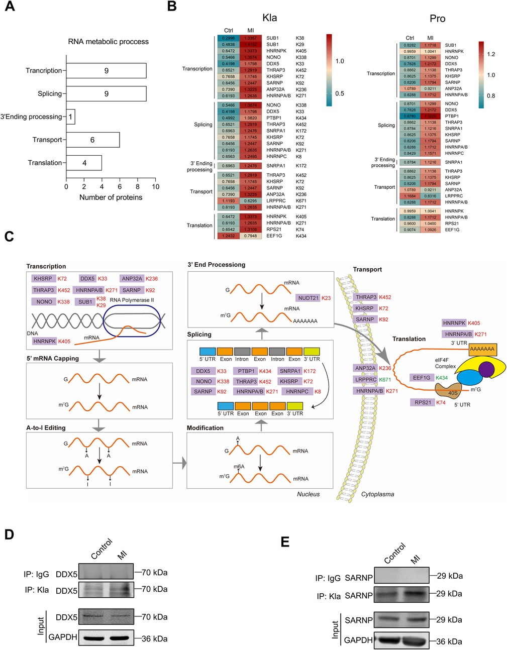 Figure 8. Kla changes of RNA binding proteins following MI. (A) Functional distribution of RNA binding proteins showing significant Kla changes post-MI. (B) Heatmap showing Kla changes (left) and protein-content changes (right) in RNA binding proteins on day 3 post MI. (C) Overview of RNA metabolic process, with altered Kla sites in the infarcted heart indicated in comparison to control hearts (Red represents upregulation, and green represents downregulation). (D,E) The Kla abundance of selected proteins (DDX5 and SARNP) detected by immunoprecipitation and western blotting.