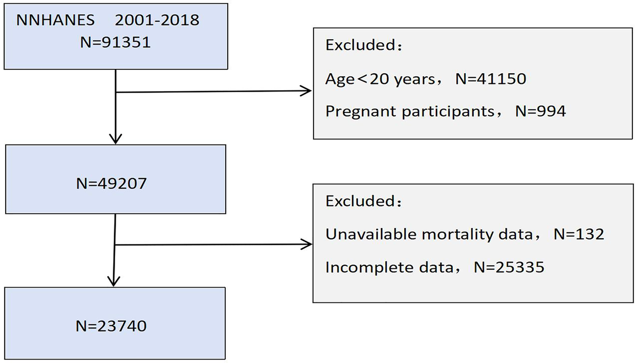 This investigation employed information from the National Health and Nutrition Examination Survey (NHANES) database (https://www.cdc.gov/nchs/nhanes/index.htm). NHANES operates as a nationally representative, multi-stage investigation executed by the National Center for Health Statistics (NCHS) and the Centers for Disease Control and Prevention (CDC), established to evaluate nutritional and health conditions among different age populations in the United States. The NCHS Ethics Review Board sanctioned all NHANES research protocols, with all participants providing informed consent. Since NHANES data are publicly available and fully de-identified, studies involving secondary analyses of the NHANES database are considered exempt from additional ethical approval according to the policy of our Institutional Review Board. The research selected adults aged 20 years and above as eligible subjects. Participants were excluded based on: (1) missing data on monocyte count or serum albumin; (2) pregnancy; (3) missing data on CVD; (4) absence of mortality data or loss to follow-up; and (5) missing key covariate information. Of the 91,351 individuals registered in NHANES between 2001 and 2018, 23,740 met the criteria for final analysis. The participant selection process is depicted in Figure 1.