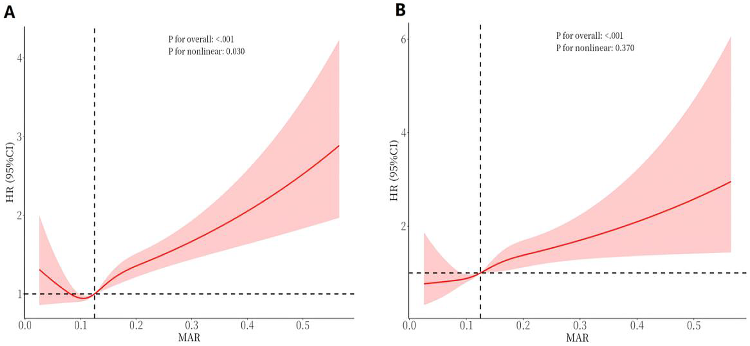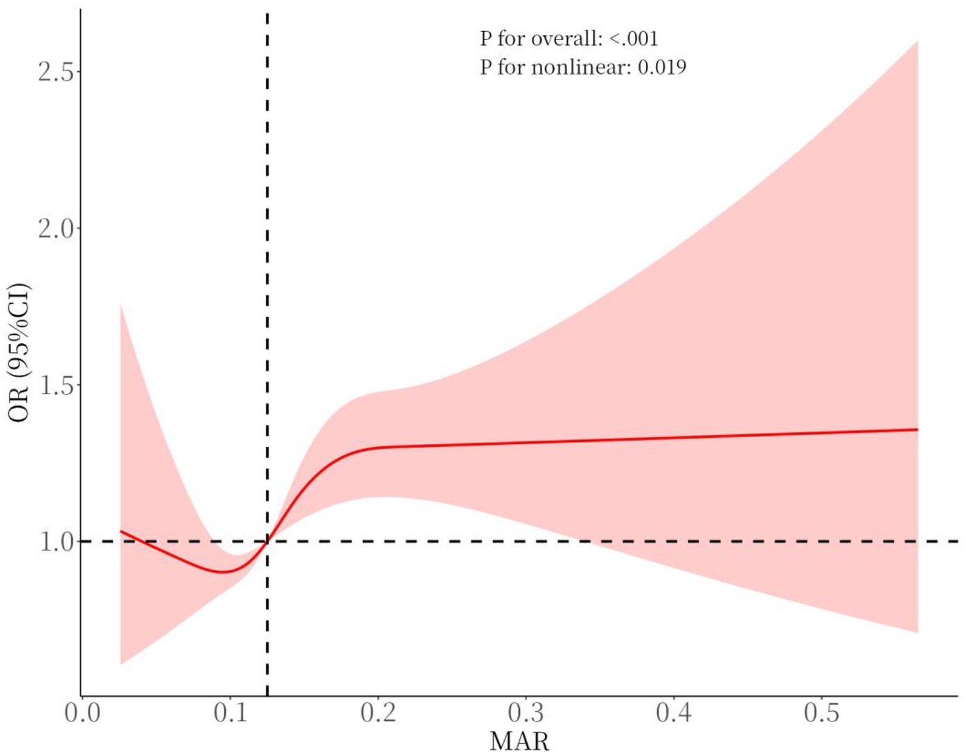 Multivariable logistic regression identified a notable positive link between MAR and CVD (p < 0.05), with a nonlinear trend confirmed by smoothing curves (nonlinear p = 0.019). Subgroup analyses indicated the consistency of this association (interaction p > 0.05). Through ROC evaluation, MAR exhibited robust predictive capability for CVD. Increased MAR measurements correlated with heightened risk of all-cause mortality [hazard ratio (HR): 1.25, 95% CI: 1.08–1.44] and CVD mortality (HR: 1.46, 95% CI: 1.10–1.93). RCS evaluation determined a nonlinear connection between MAR and all-cause mortality (nonlinear p < 0.05). The results maintained stability throughout sensitivity and stratified assessments.