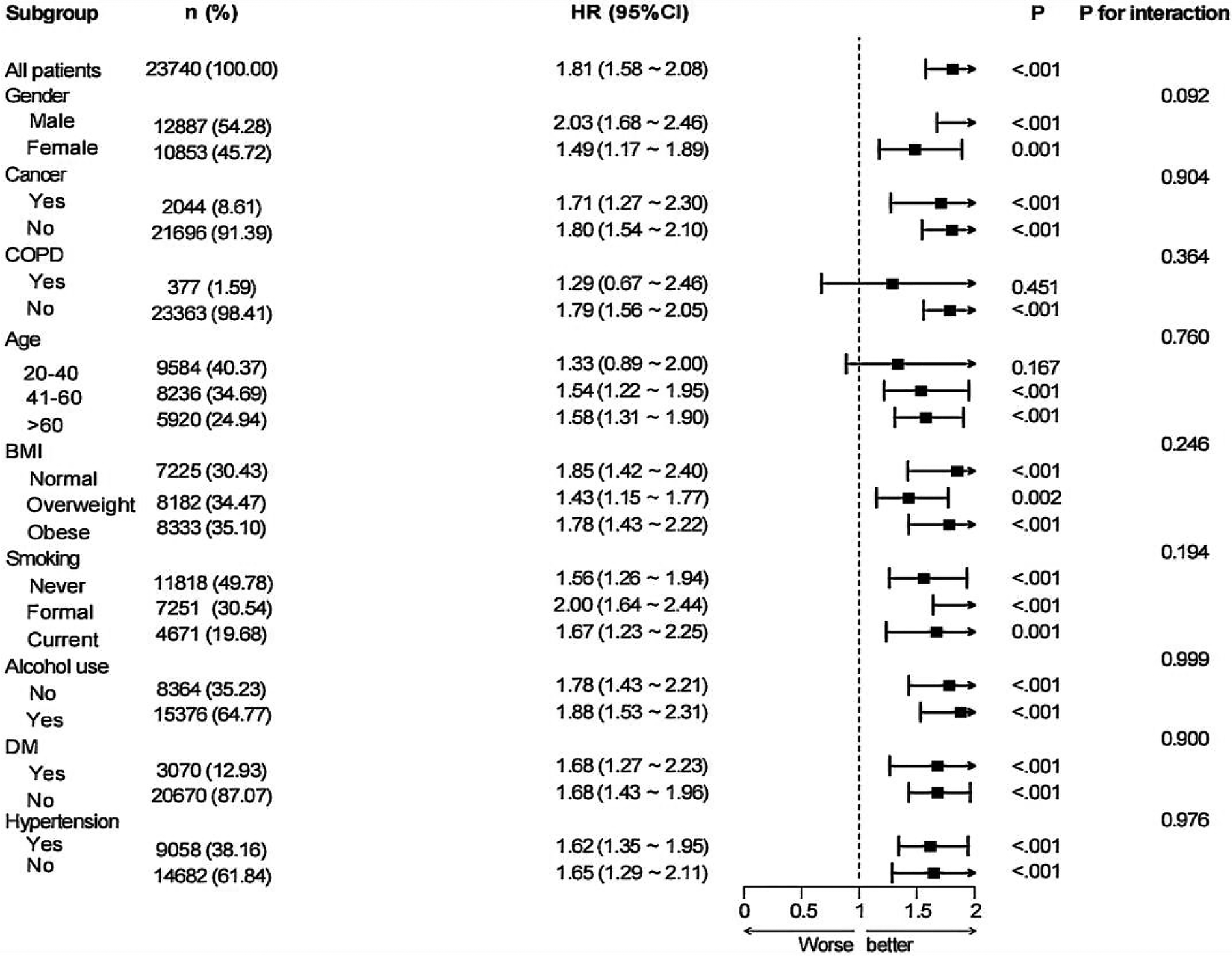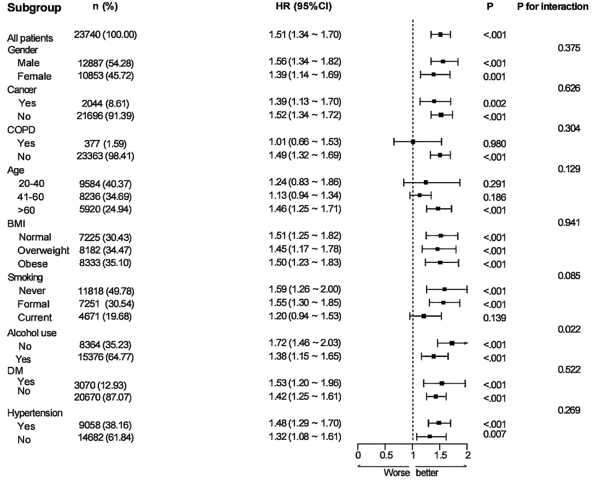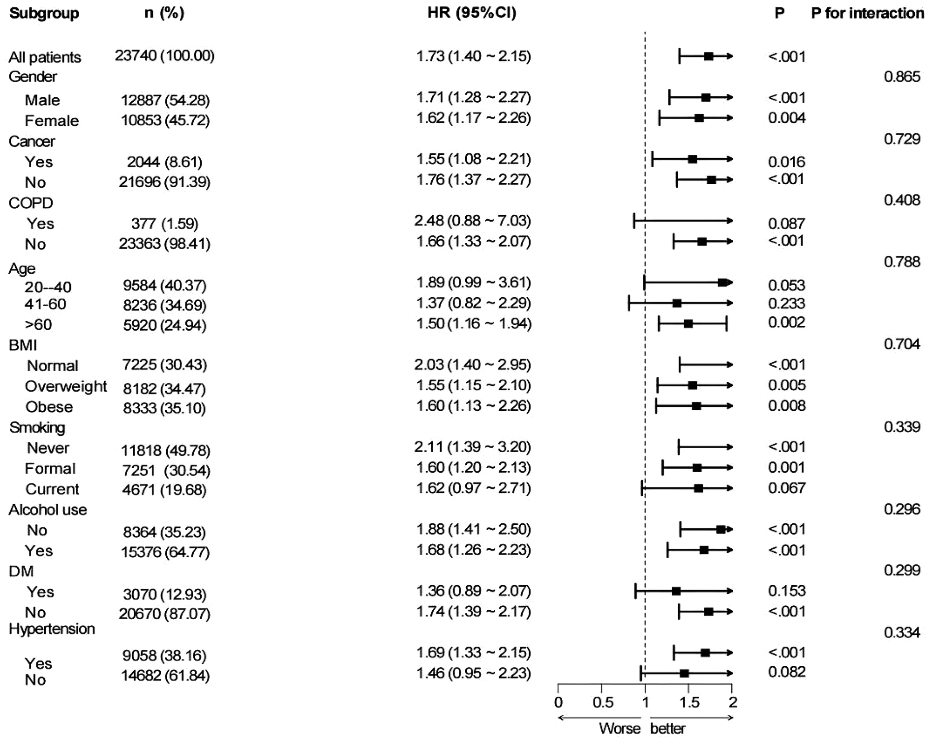 Based on relevant studies and considering potential confounders, this study incorporated the following covariates from NHANES interview and laboratory data: age (years); sex (male or female); race/ethnicity (non-Hispanic White, non-Hispanic Black, Mexican American, and other); educational background (less than high school, high school graduate, and post-high school); relationship status (married/Living with partner, widowed/divorced/separated/never married); family poverty income ratio (PIR) (≤ 1.30, 1.31–3.50, >3.50); total cholesterol level (TC, mg/dl); smoking habits (never smokers: persons who smoked fewer than 100 cigarettes throughout their lifetime; current smokers: individuals who smoked more than 100 cigarettes and continued smoking during the survey period; former smokers: subjects who smoked more than 100 cigarettes but stopped before the survey); alcohol intake (characterized as consuming more than one 12-ounce beer, one 5-ounce glass of wine, or 1.5 ounces of liquor in the previous year); body mass index (BMI): normal weight (<25 kg/m2), overweight (25–30 kg/m2), and obese (>30 kg/m2); diabetes (identified through self-reported history, antidiabetic medication or insulin usage, fasting plasma glucose ≥7.0 mmol/L, or hemoglobin A1c ≥ 6.5%) (24); hypertension (determined by the average of four measurements with systolic blood pressure ≥140 mmHg and/or diastolic blood pressure ≥90 mmHg) (26). Cancer, COPD, and CVDs were established through self-reported physician diagnoses. Additional information appears on the NHANES website.