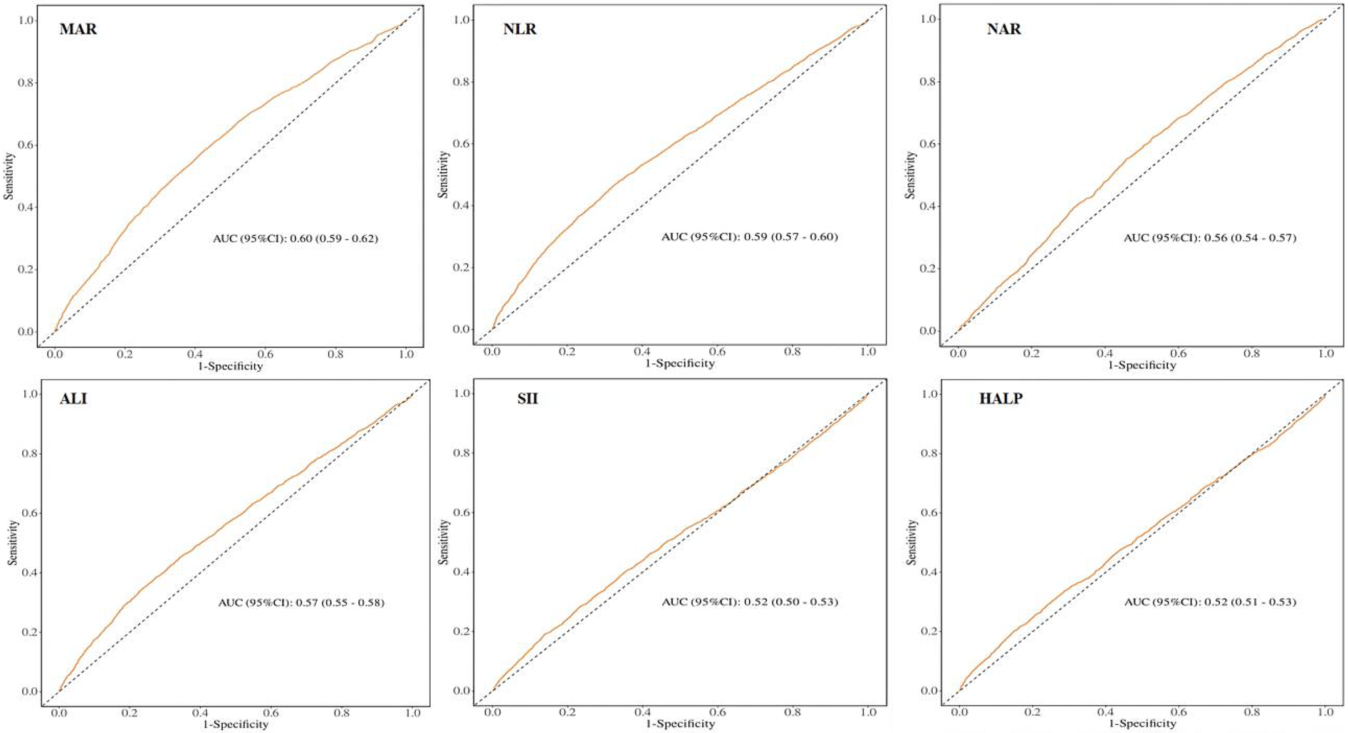 After standardizing MAR, a multi-stage modeling approach was employed to explore the relationship between MAR and the risk of CVD and mortality. For the CVD investigation, a three-tiered multivariable logistic regression model was established: Model 1 remained unadjusted; Model 2 adjusted for demographic parameters (age, sex, and race); while Model 3 incorporated additional adjustments for potential confounding factors. The nonlinear relationships between MAR and CVD were investigated utilizing restricted cubic spline (RCS), while threshold effects were identified through likelihood ratio testing. Subgroup analyses per the demographic and clinical characteristics were conducted to evaluate effect modification. Furthermore, receiver operating characteristic (ROC) curve evaluation measured the diagnostic performance of MAR regarding various cardiovascular endpoints (CVD, CHF, CHD, angina, myocardial infarction, and stroke), comparing variations in areas under the curve (AUCs).