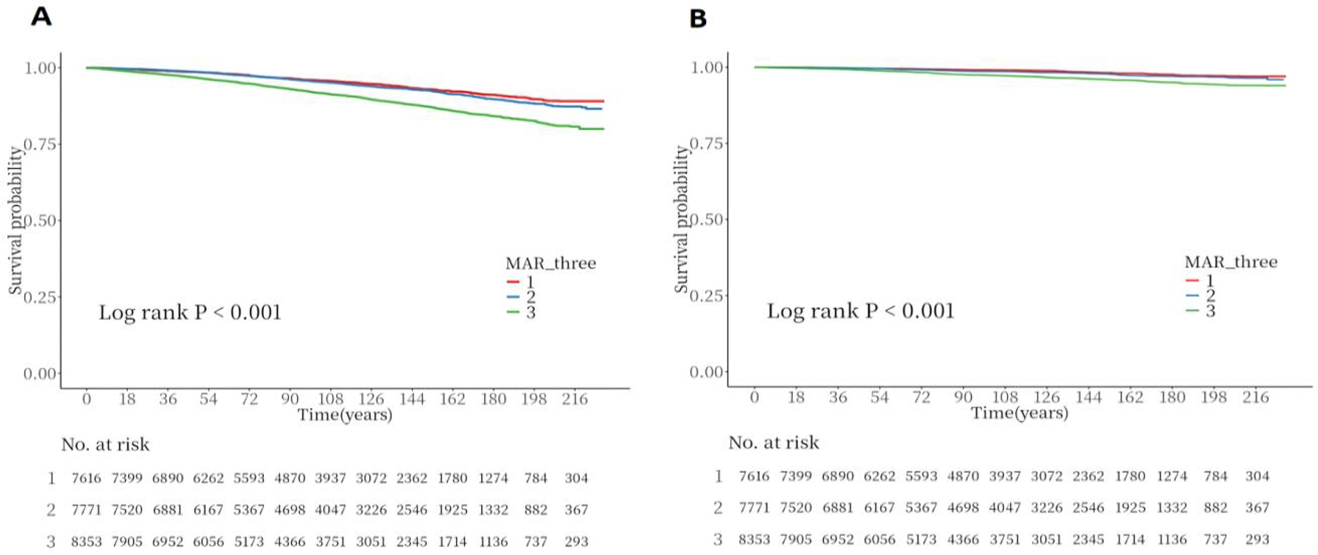 The mortality evaluation employed Cox proportional hazards modeling, incorporating an identical three-tiered adjustment approach to investigate associations between MAR and mortality endpoints, encompassing both all-cause and cardiovascular outcomes. The survival differences across groups utilized Kaplan–Meier curve analysis (categorized by MAR tertiles) alongside log-rank testing methods. To illustrate the dose-response correlation between MAR and death risk, RCS regression techniques were employed.