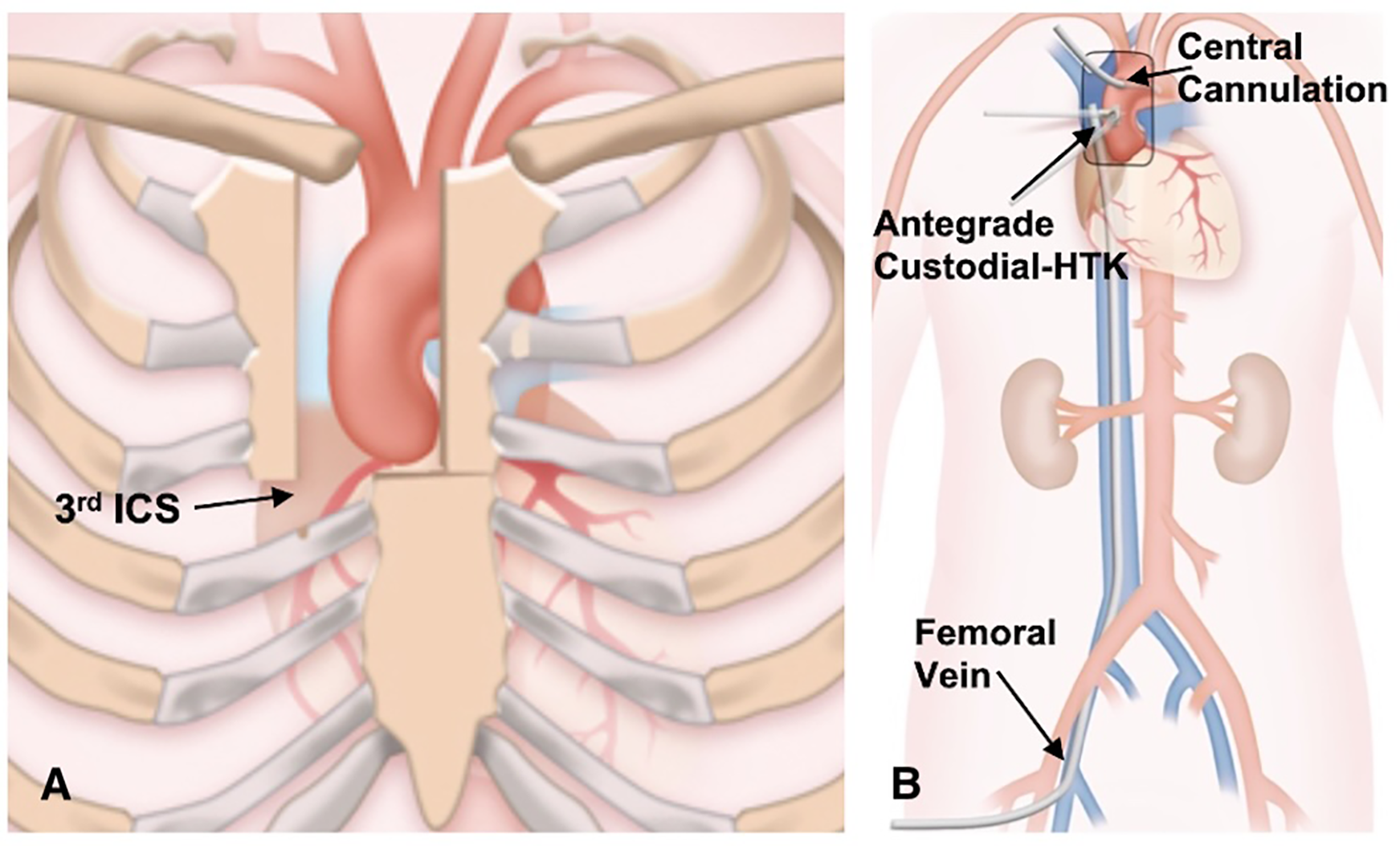 (A) the J-type upper hemisternotomy exiting the right third intercostal space. (B) Cannulation strategy for upper hemisternotomy.