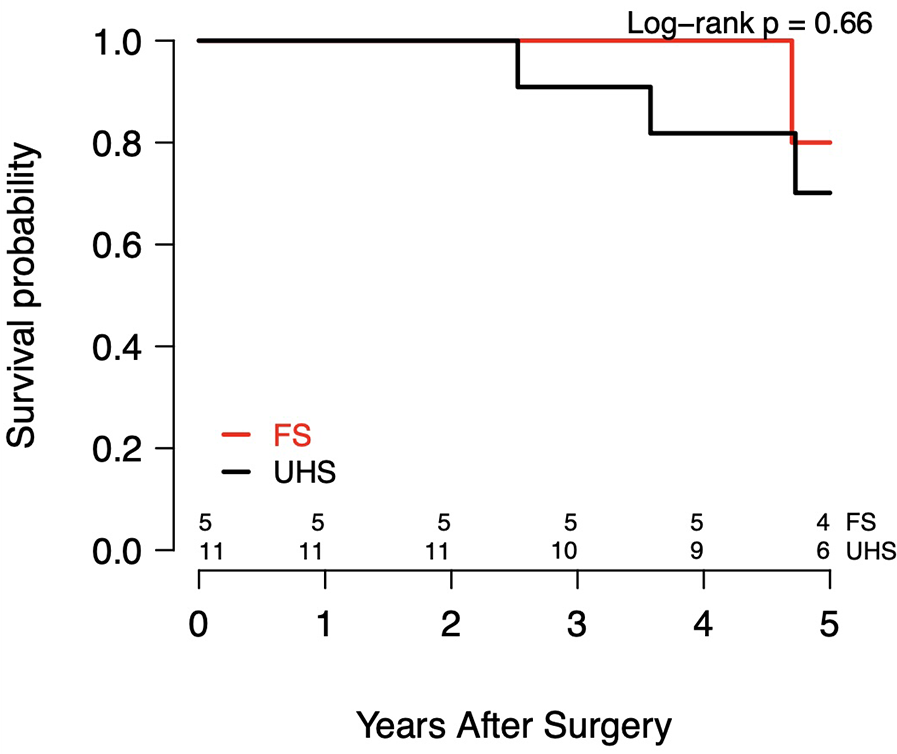 There were no in-hospital deaths in either cohort. As summarized in Table 3, which reports on the postoperative outcomes, there were no postoperative strokes, TIAs, renal insufficiency, or reoperations for bleeding in either group. The hospital LOS was 7 d (IQR, 6–11 d) for UHS patients and 8 d (IQR, 7–13 d) for FS patients (P = 0.51). Among 11 patients with follow-up in the UHS cohort, overall survival was 100% at 1 yr and 72.7% at 5 yr (P = 0.13). In the FS cohort, which included 5 patients with follow-up, overall survival was 100% at 1 yr and 80.0% at 5 yr (P = 1.00) (Table 4). The Kaplan–Meier survival curves for both cohorts are shown in Figure 4. There were no reinterventions or distal aortic events after UHS.