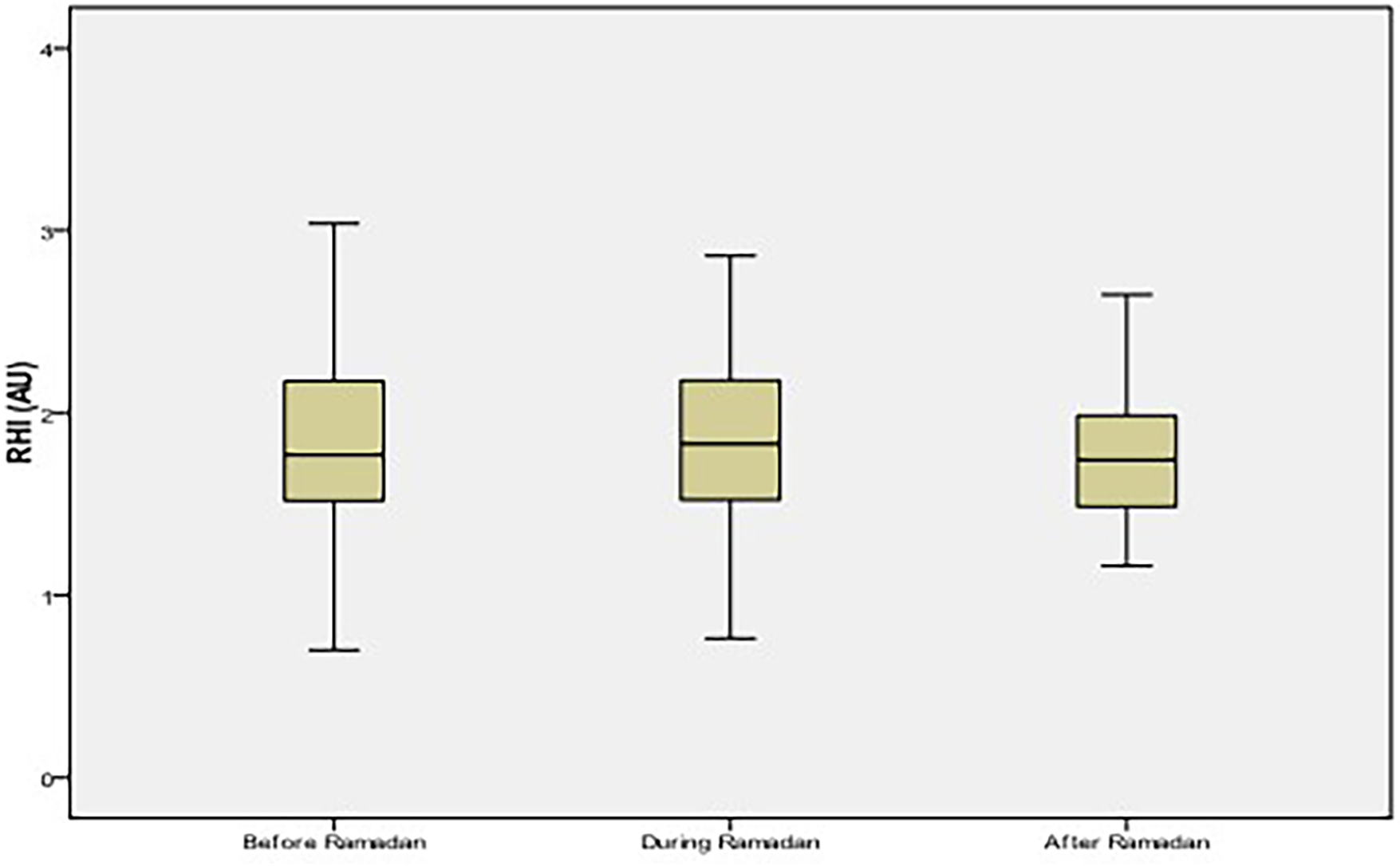 The mean age was 47 ± 13 years (21–81 years) with a male/female ratio 0.3. Apart from a history of smoking found in 4% of subjects, no other comorbidities were reported. An RHI ≤ 1.6, indicating impaired endothelial function, was present in 45% of the group. The changes of RHI during-R and after -R were not significant compared to before-R (Figure 1). Changes in metabolic parameters during-R and after-R compared to before-R period are shown in Table 1. No significant changes were observed with regard to triglycerides and HDL cholesterol, while the serum glucose, total cholesterol, and LDL cholesterol increased significantly during Ramadan compared to before-R. BMI and DII decreased significantly during-R compared to before-R (p < 0.001). The hs-CRP levels increased during-R compared to before-R and decreased after-R (p = 0.01).