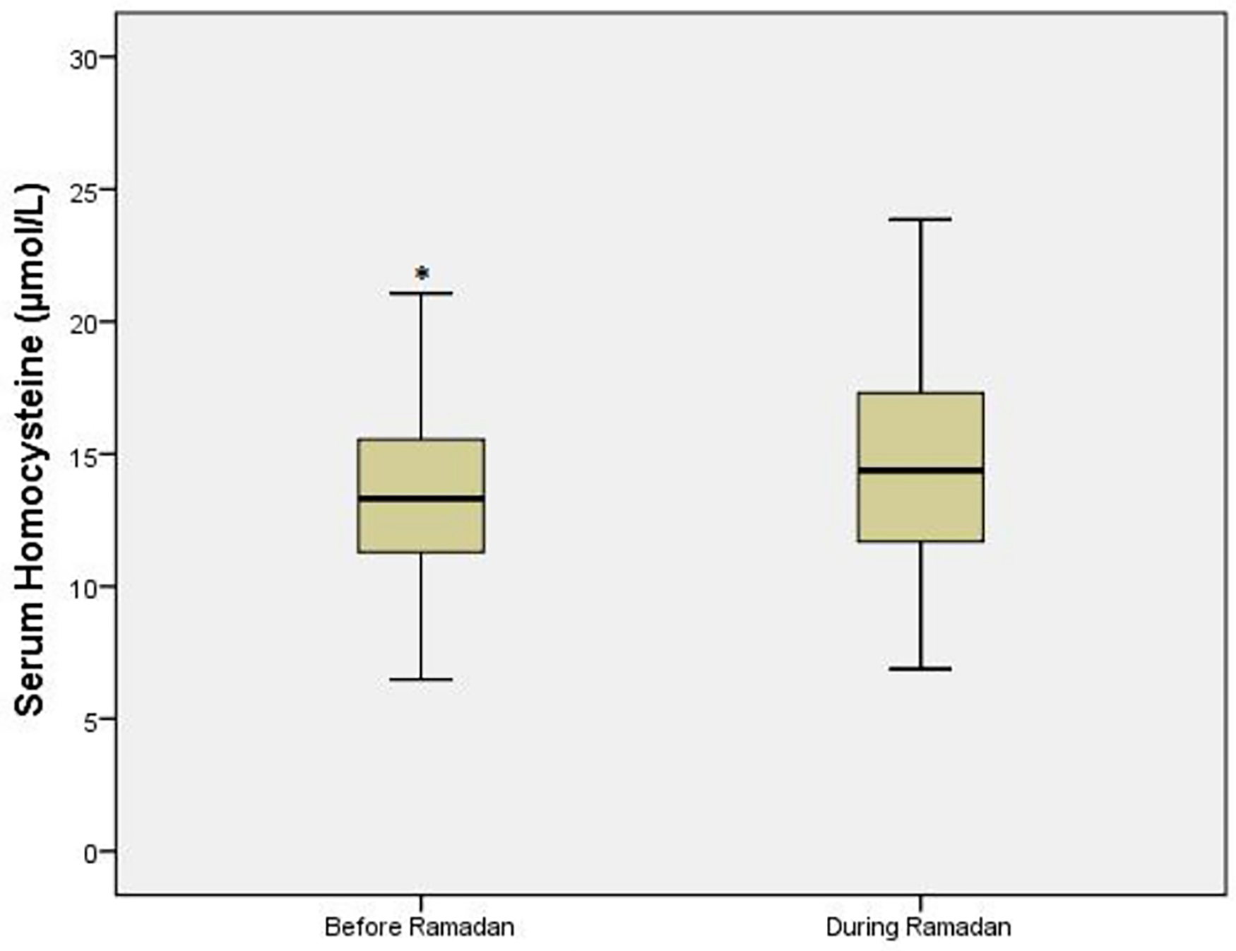Homocysteine values in T2DM patient. *p ≤ 0.05 vs. during Ramadan.
