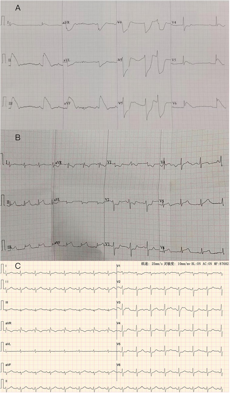 Figure 1. (A) ECG: the ECG shows a 0.1–1.0 mv ST elevation at leads DI, II, III, aVF, V5, V6, with reciprocal depression in DaVL, V1, V2, V3 and V4. (B) ECG: The ECG shows a 0.1–0.2 mv ST elevation at leads DII, III, aVF, V5, V6, with reciprocal depression in DI, aVL, V1, V2, and V3. (C): Repeated ECG revealed normal sinus rhythm with no significant ST-T changes in all leads.