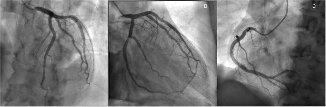Figure 2. Coronary angiography revealed nonobstructive coronary arteries in the LAD, (A), LCX, (B) RCA (C).