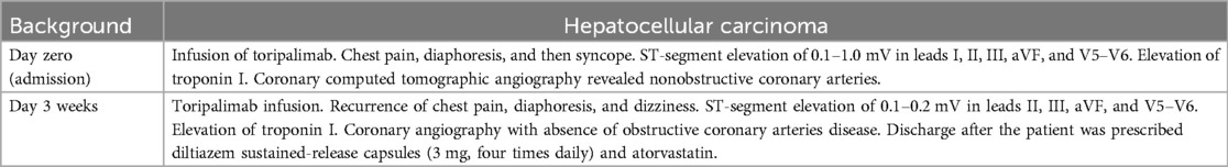 He was transferred back to the former department to complete the anti-tumor therapy after being stable. Throughout the subsequent anti-tumor treatment, the patient did not experience any chest pain or discomfort. Moreover, during his follow-up on an outpatient basis, he did not experience a recurrence of the previously reported chest discomfort or any other symptoms. Patient's timeline is shown in Table 1.