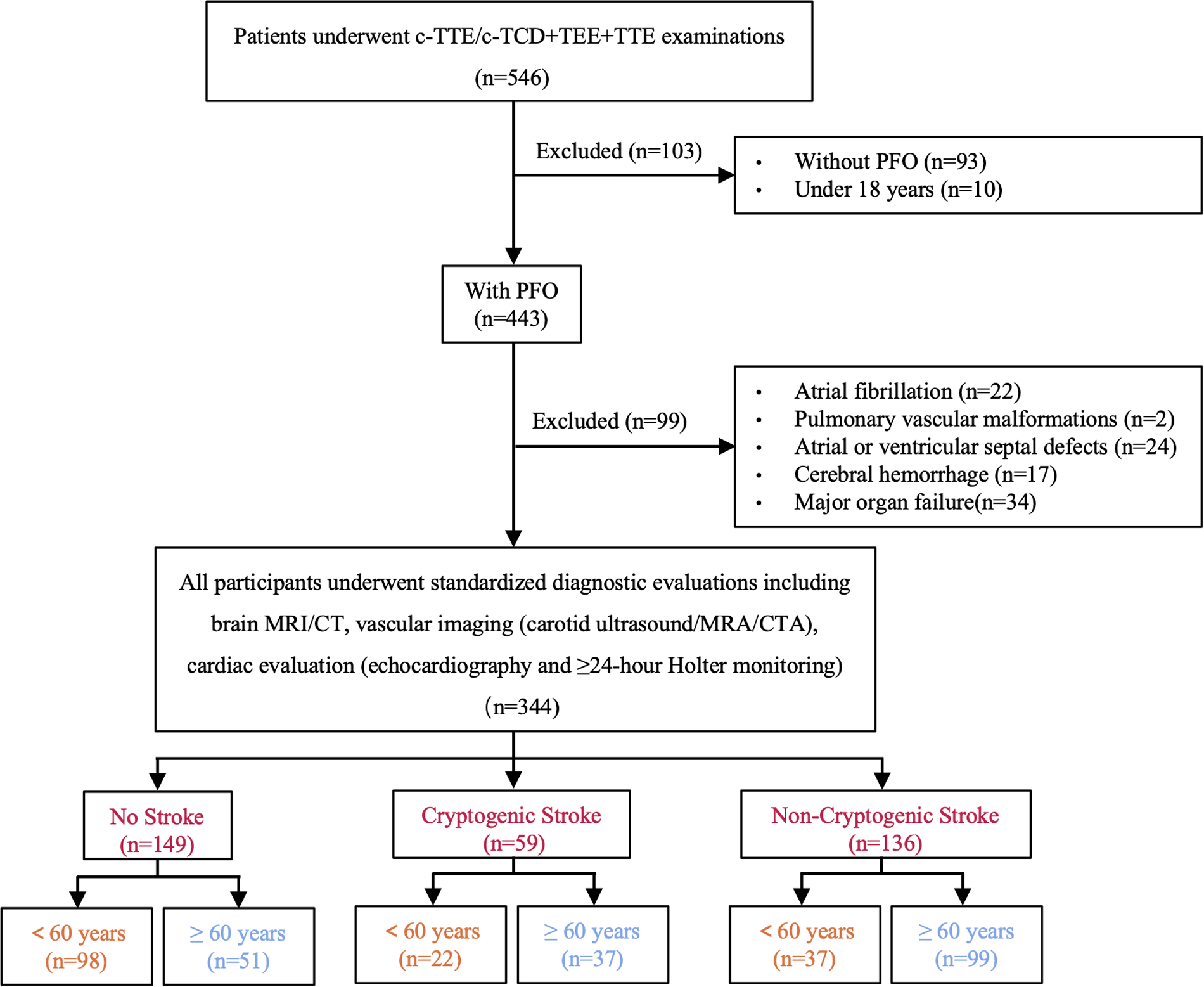 This retrospective study was approved by the Institutional Review Board (IRB) of The Second Affiliated Hospital of Guangzhou University of Chinese Medicine (Ethics approval number: ZE2025-034-01). The requirement for written informed consent was waived by the IRB due to the retrospective nature of the study and use of anonymized data. All procedures followed the principles of the Declaration of Helsinki. TEE was performed for clinical evaluation of suspected PFO or CS in routine clinical practice, as part of standard diagnostic workup. Data were retrospectively collected for this study, with no additional examinations conducted specifically for this study. We enrolled 344 consecutive patients aged over 18 years admitted to our hospital between January 2021 and December 2024 who were diagnosed with PFO by transesophageal echocardiography (TEE), with intracardiac shunt confirmed by either contrast-enhanced transcranial doppler (c-TCD) or contrast-enhanced transthoracic echocardiography (c-TTE) (17). All participants underwent standardized diagnostic evaluations including brain MRI/CT, vascular imaging (carotid ultrasound/MRA/CTA), cardiac evaluation (echocardiography or 24 h Holter monitoring) to assess whether there was moderate or severe stenosis of the responsible artery, arrhythmias, or cardiac thrombi. All examinations were performed by experienced echocardiographers, and the results were assessed by another investigator, both of them were blinded to the patient's stroke status. Exclusion criteria included atrial fibrillation, pulmonary vascular malformations, atrial or ventricular septal defects, cerebral hemorrhage, and major organ failure (cardiac, hepatic, pulmonary, or renal) to ensure a homogeneous study population focused on PFO-related cerebrovascular outcomes (Figure 1).