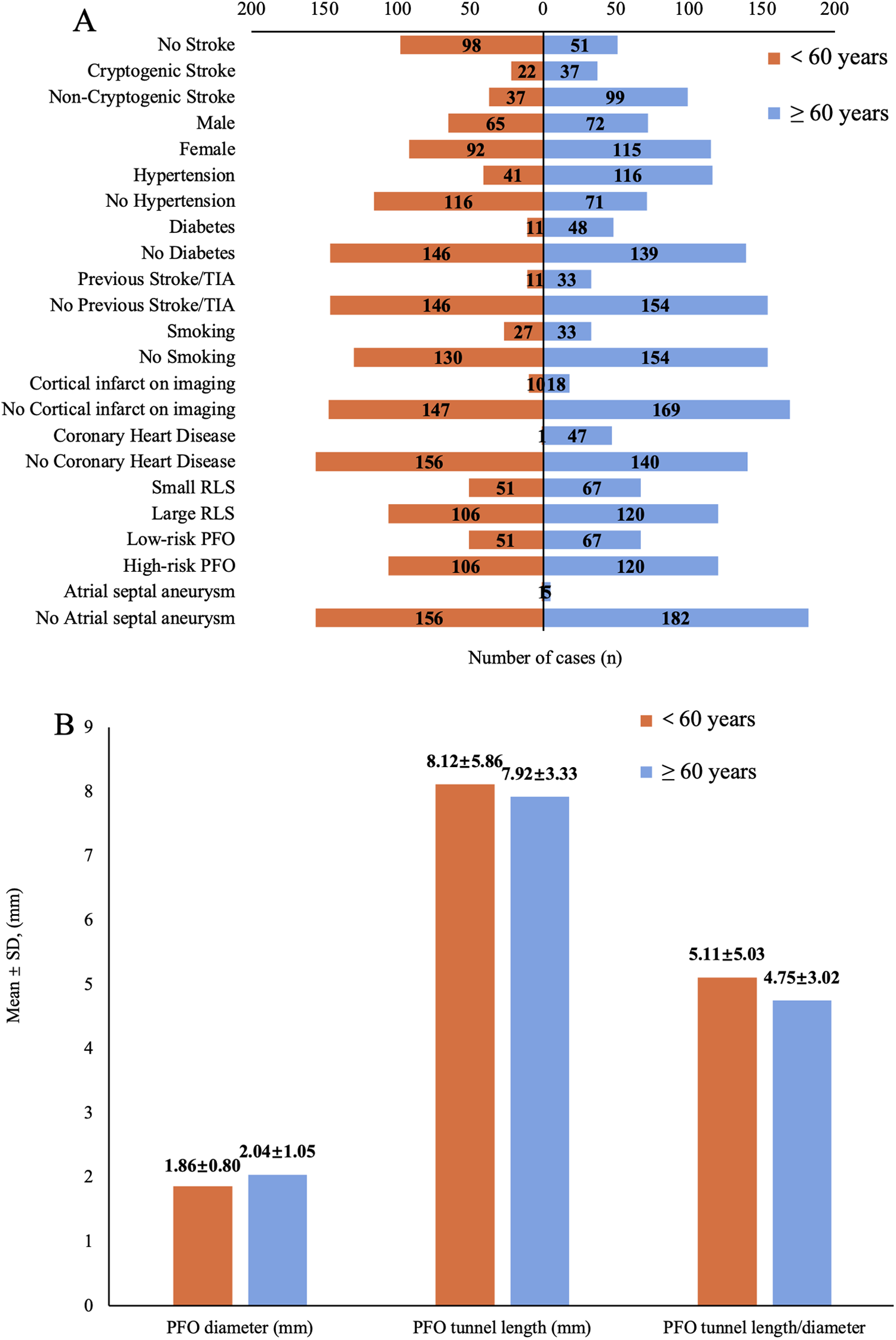 (A) Number distribution of demographic characteristics, comorbidities, and imaging parameters across age subgroups. (TIA, transient ischemic attack; RLS, right-to-left shunt; PFO, patent foramen ovale). (B) Mean ± SD of the patent foramen ovale (PFO) diameter, tunnel length and their ratio after subgroup analysis by age.