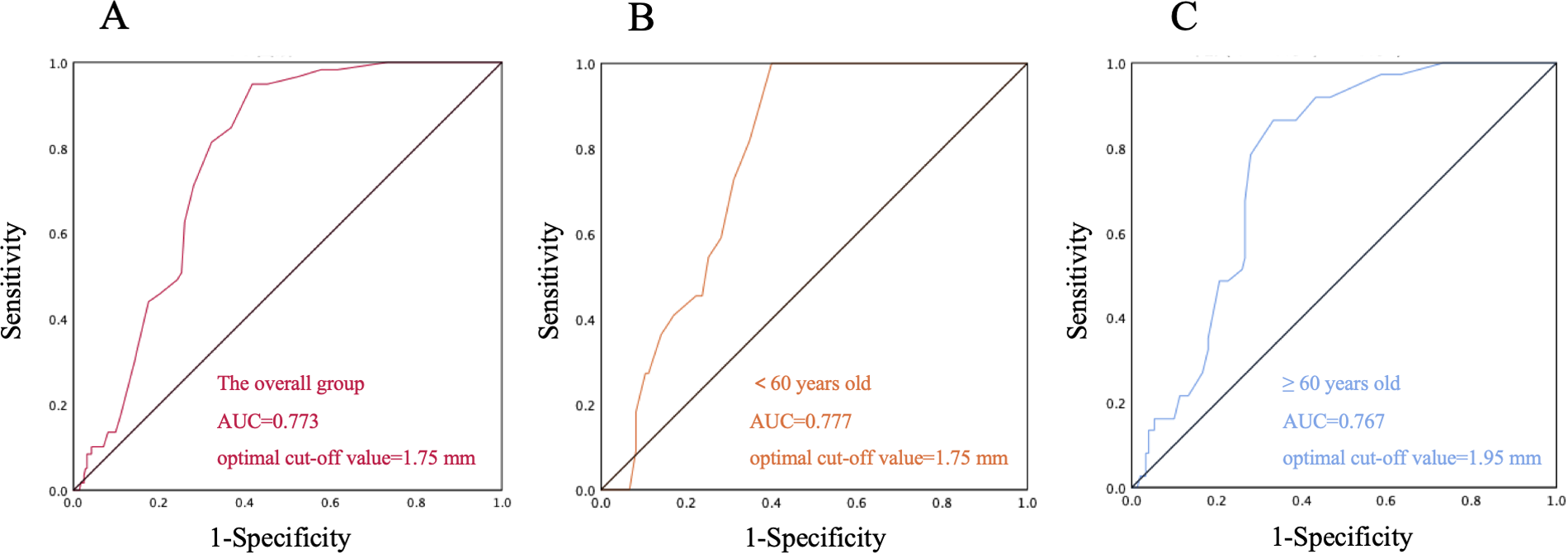 Variables included in multivariate logistic regression models were selected based on a combination of prior knowledge (potential confounders identified from existing literature) and univariate analysis results (variables with P < 0.05 in univariate tests), ensuring both theoretical relevance and data-driven inclusion. Model validity was assessed via SPSS-generated outputs: acceptable goodness-of-fit was confirmed by a non-significant Hosmer-Lemeshow test (P > 0.05), and significant multicollinearity was ruled out with all variance inflation factor (VIF) values <5 derived from collinearity diagnostics. Then, a multivariate logistic regression analysis was carried out to analyze the relevant influencing factors, and a subgroup analysis was done according to age (<60 years vs. ≥60 years). To address potential type II errors, a post-hoc power analysis was conducted using PASS 15.0 (NCSS LLC). Power for logistic regression models was computed based on observed odds ratios with α = 0.05 (two-tailed). Power ≥80% was deemed adequate, 70%–79% marginal, and <70% inadequate. Subgroup analyses by age (<60 vs. ≥60 years) were explicitly evaluated for statistical power. The Receiver Operating Characteristic (ROC) curve was employed to evaluate predictive efficacy and determine cut-off values (determined by Youden's index), with P < 0.05 considered statistically significant.