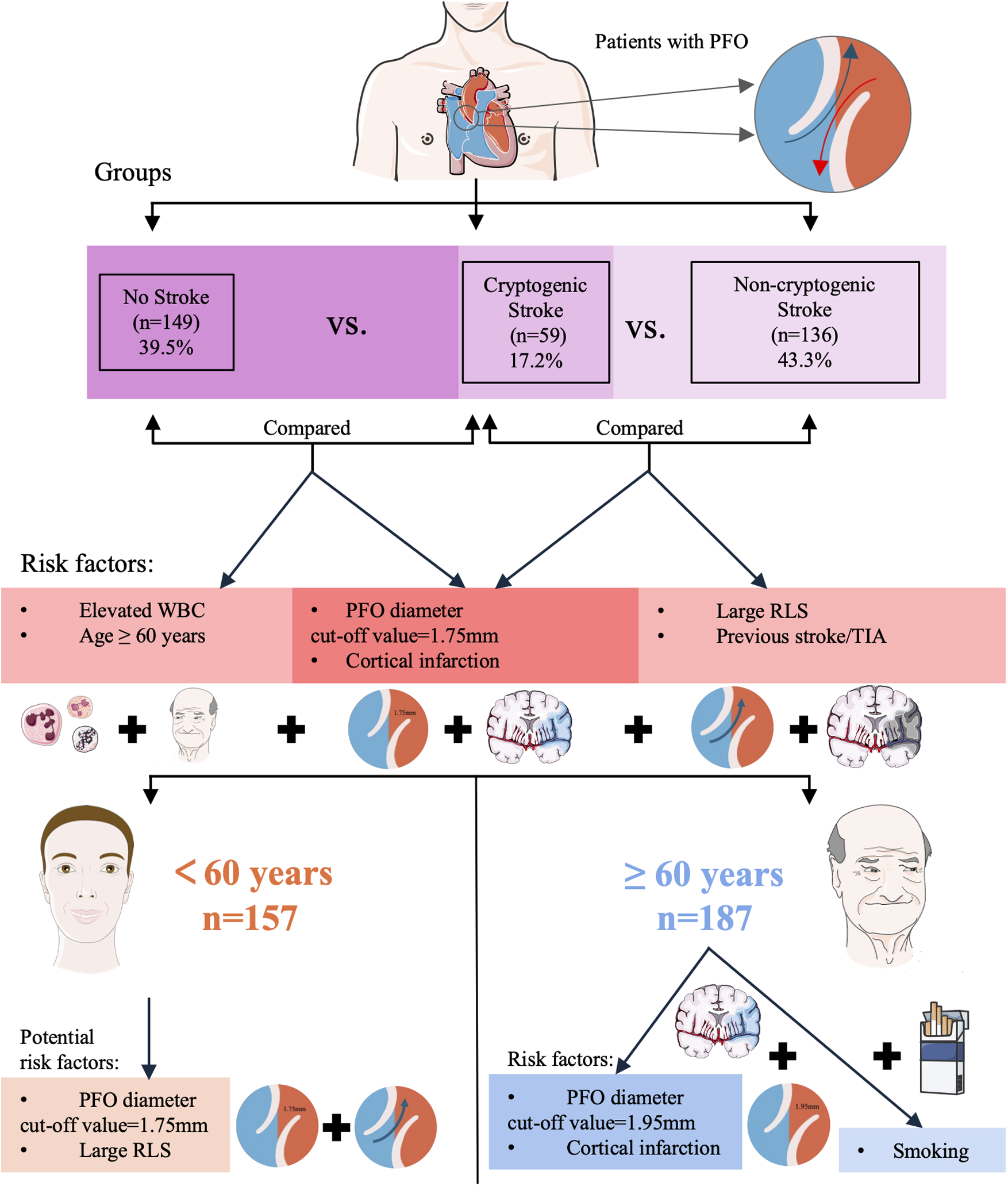 Stroke is the second leading cause of death worldwide, and 20%–30% of them are classified cryptogenic stroke (CS) (1). Patent foramen ovale (PFO), a common cardiac anatomical variant present in 20%–25% of the general adult population (2, 3), is detected in 40%–50% of young CS patients (4, 5). PFO is also implicated in multiple pathologies, including migraine with aura (6), decompression sickness (DCS) (7), and platypnea-orthodeoxia syndrome (8). The prevailing mechanistic hypotheses involve right-to-left shunt (RLS) and paradoxical embolism (9). However, not all PFO carriers develop strokes, with pathogenic risk modulated by anatomical features (e.g., PFO diameter, tunnel length, atrial septal aneurysm), RLS volume, and clinical factors such as inflammation or metabolic disturbances (10). Existing risk stratification tools, such as the Risk of Paradoxical Embolism (RoPE) scoring system (11) and the PFO-Associated Stroke Causal Likelihood (PASCAL) system (12), have limited applicability in elderly populations due to comorbidities and underweighted age contributions (RoPE assigns age only 1 or 0 points). Previous studies have shown that hypercoagulability (13), chronic inflammation, and metabolic issues can increase stroke risk by promoting thrombus formation, suggesting PFO's pathogenicity results from multiple factors.