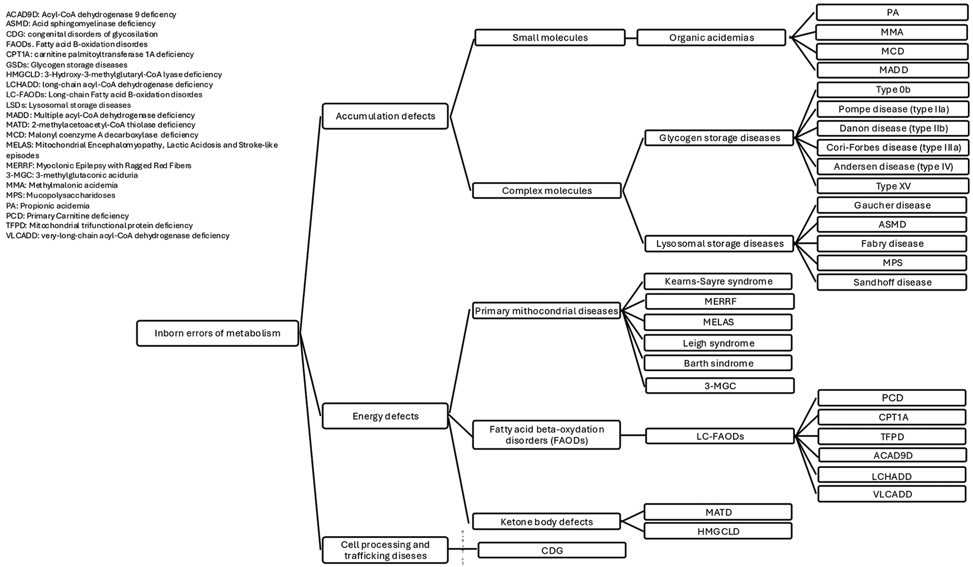 Approximately 5% of all Inborn Errors of Metabolism (IEMs) are associated with cardiomyopathy, a group of conditions characterized by abnormalities in the structure or function of the heart muscle (1). Cardiac disease may present as the first clinical manifestation or may develop during follow-up, varying in both pattern and severity, potentially progressing to heart failure (HF). IEMs affect cellular metabolic pathways including fatty acid oxidation (FAO), mitochondrial respiration and carbohydrate metabolism (2). The latest classification includes three main categories: “small molecules disorders”, “complex molecules disorders”, with subtypes based on accumulation or deficiency, and “energy defects”. Within the “accumulation type small molecule disorders”, some organic acidurias may present with cardiac involvement (3). Cardiac involvement is common in both muscular and hepatic glycogenosis and in several lysosomal storage disorders (LSDs), which are examples of “complex molecules disorders” with substrates accumulation. Within the “energy defects” category there are mitochondrial metabolic diseases that affect energy metabolism (3). Since the heart is an organ with high energy demands, it is frequently involved in fatty acid (FA) oxidation defects and disorders of the respiratory chain (3). Moreover, in the group of cell processing and trafficking defects of complex molecules, there are congenital disorders of glycosylation (CDG) (2, 3). They affect multiple systems, with phenotypical variability, including the cardiovascular system. Figure 1 provides a simplified classification of the diseases under discussion. Therefore, cardiac damage in IEMs may result from enzyme malfunction, leading to the accumulation of compounds harmful to the heart, energy deficiency, or impaired cardiac tissue development and function. Nutrition is a crucial aspect of care in patients affected by cardiological symptoms as the hemodynamic burden, progression of HF, and feeding intolerance often contribute to malnutrition (4), including those IEMs with cardiological involvement. Dietary treatment is essential for many IEMs. In recent years, various dietary regimens have been applied with the goal of both managing the disease and supporting cardiac function (5).