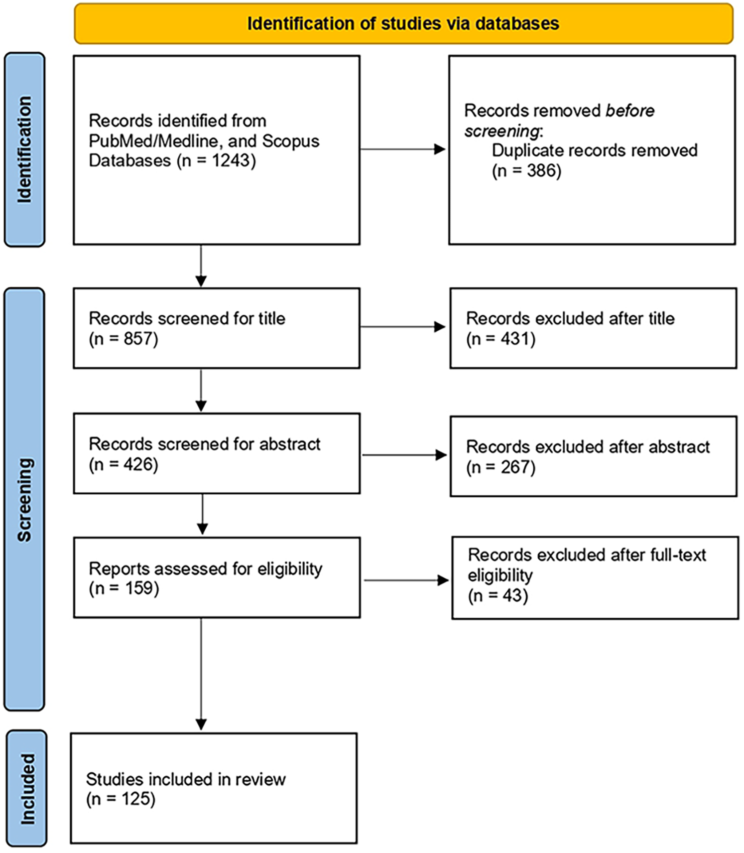 The initial systematic search retrieved a total of 1,243 articles published until 2025. After removal of duplicates, a total of 857 and 426 articles were screened for title and abstract, respectively. The remaining 159 articles were screened for full text. We finally included 125 articles. Figure 2 presents the flowchart of the review process.