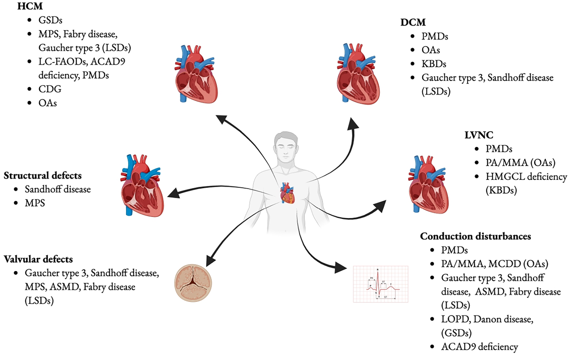 “Small molecule accumulation disorders” include amino acid catabolism disorders, urea cycle defects, organic acidurias, and galactosemia (3). These disorders have specific biomarkers, and after a symptom-free period, the accumulation of small molecules causes acute or progressive postnatal “intoxication,” worsened by food intake and catabolism. Dietary treatment aims to exclude the toxic compound and prevent catabolism. Rare conditions such as organic acidemias (OAs) lead to harmful metabolite accumulation in the heart and other tissues, leading to organ dysfunction. Clinical presentation may follow protein intake with acute neonatal onset, metabolic decompensation and neurological involvement, or follow a chronic course. Cardiomyopathies associated with OAs include dilated (DCM), hypertrophic (HCM), and left-ventricular non-compaction (LVNC) (3).