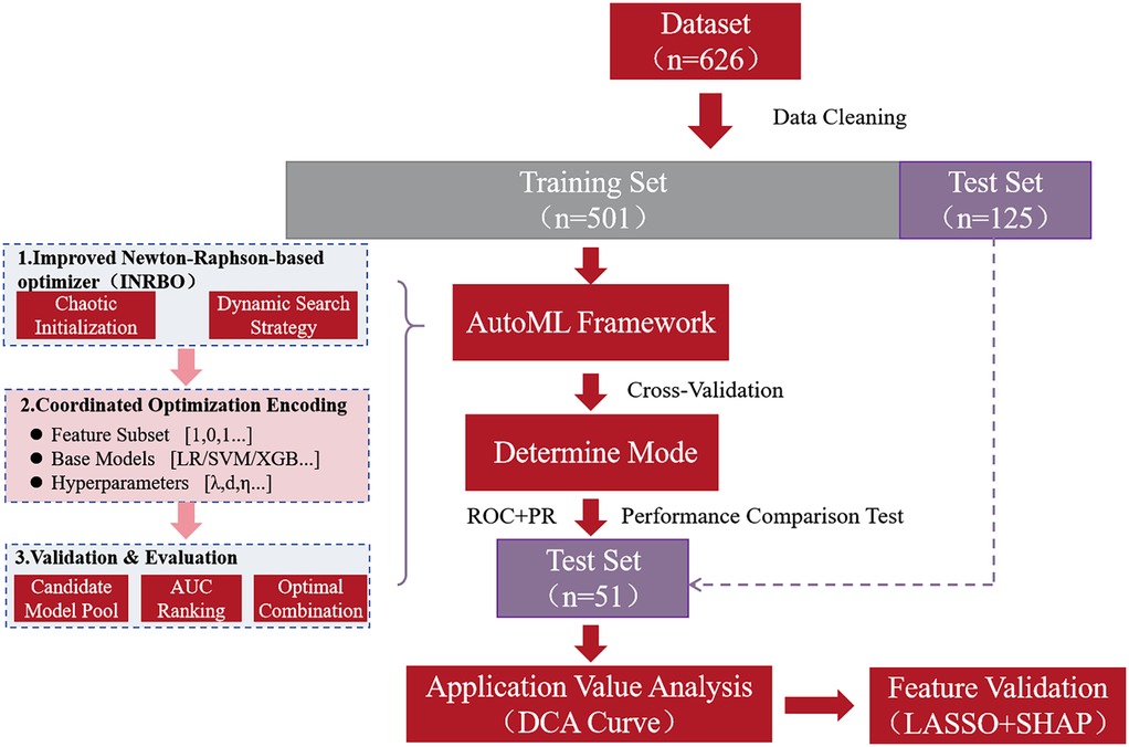 During model construction, a hybrid encoding scheme (0–1 feature mask vector+base classifier index code + real-valued hyperparameter vector) was designed to establish a unified optimization space. Each generated individual in the INRBO population encoding represented a specific configuration: selected feature subset (1 for inclusion, 0 for exclusion), type of base learner (selected from a heterogeneous model pool comprising Logistic Regression, Support Vector Machine, AdaBoost, XGBoost, and LightGBM), and associated hyperparameter combinations [e.g., regularization coefficient λ ∈ (0.01, 10), maximum tree depth for boosting d ∈ (3, 15), learning rate η ∈ (0.001, 0.3)]. The algorithm's fitness evaluation was driven by the five-fold cross-validated Area Under the Receiver Operating Characteristic Curve (AUC) on the training set. The model's generalization performance was validated using the independent test set. The final output of the framework corresponded to the optimized feature-model-hyperparameter joint configuration. The overall research workflow is depicted in Figure 1.
