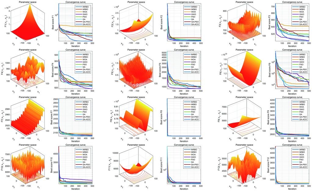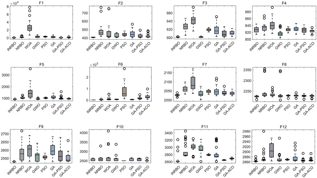 To verify the optimization capability of the improved INRBO algorithm, our study conducted comparative tests against the original NRBO, Whale Optimization Algorithm (WOA), Grey Wolf Optimizer (GWO), Particle Swarm Optimization (PSO), Genetic Algorithm (GA), GA-PSO hybrid algorithm, and GA-Ant Colony Optimization (ACO) hybrid algorithm. The experiments utilized all 12 benchmark functions from the CEC2022 test suite. All testing functions were configured with a variable dimension of 10, a population size of 30, and a maximum iteration count of 500. Each algorithm was independently run 30 times to ensure statistical reliability. Based on the 30 independent run outcomes, box plots were generated to assess the optimization stability of each algorithm. The results demonstrated that INRBO consistently outperformed its counterparts in the vast majority of the test functions, showcasing significantly superior stability compared to the original NRBO and the other benchmarked algorithms (Figure 2). Furthermore, convergence curve analysis indicated that INRBO achieved faster convergence speeds and exhibited the lowest risk of becoming trapped in local optima during the iterative process (Figure 3). These experimental findings conclusively substantiate the significant advantages of the INRBO algorithm in terms of global optimization performance and convergence efficiency.
