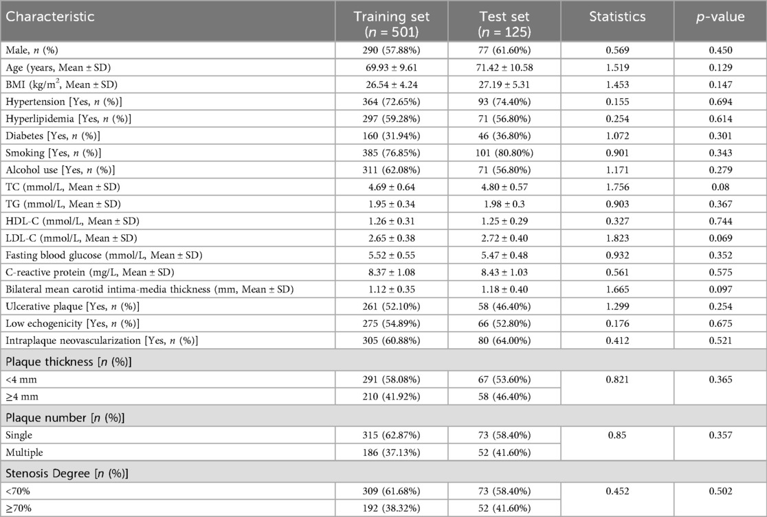 A total of 626 patients were included in our study. Among them, 375 patients (59.90%) experienced symptomatic ICVD. The clinical characteristics of patients in the training set (N = 501) and the test set (N = 125) are compared below (Table 1). The results demonstrate no statistically significant differences (p > 0.05) in any of the clinical characteristics between the two datasets.