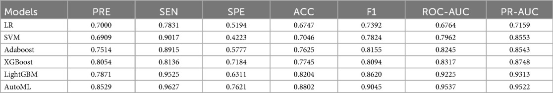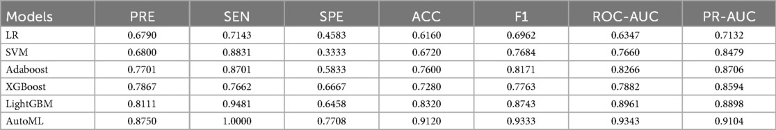 Results on the independent test set confirmed the outstanding predictive capability of the AutoML model: It achieved an F1-Score of 0.9333, ROC-AUC of 0.9343, and PR-AUC of 0.9104. This strong performance validated its excellent generalization ability. Detailed metrics are listed in Table 3 and visualized in Figure 5.