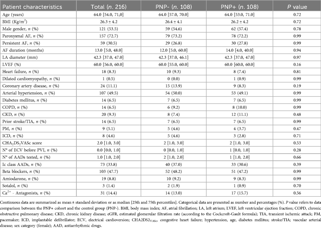 Globally, 157 (72.7%) patients were affected by paroxysmal AF (PAF): 79 (73.2%) patients in the control group and 78 (72.2%) in the PNP+ group (p = 0.99).