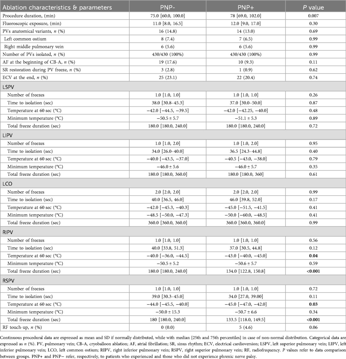 Total freeze duration was not different for left superior PV (LSPV), left inferior PV (LIPV), and left common ostium (LCO) (p = 0.72; p = 0.61; p = 0.99) but was significantly shorter in the PNP+ group compared to the control cohort, for both RIPV [134.0 (122.75, 150.75) sec vs. 180.0 (180.0, 240.0) sec, p < 0.001] and RSPV [133.5 (118.0, 149.5) sec vs. 180 (180.0, 240.0) sec, p < 0.001]. In the same way, also the temperatures reached after one minute of freeze were lower in the PNP+ group for RIPV [−43.0 (−45.0, −40.0)°C vs. −40.0 (−44.5, −36.0)°C], p = 0.04) and RSPV [−44.0 (−45.5, −40.0)°C vs. −45.0 (−47.0, −42.0)°C, p = 0.03], but similar for LSPV, LIPV and LCO (p-value ranging between 0.41 and 0.79). Time to isolation (TTI) proved to be similar for all pulmonary veins; a trend towards lower TTIs in the PNP+ group was present for RSPV and RIPV even if it did not reach statistical significance (p = 0.11 and 0.12, respectively).