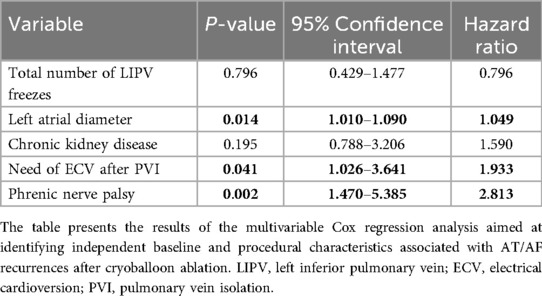 After the univariate Cox regression analysis, “Left atrial diameter” [p = 0.003, CI (1.02–1.09)], “CKD” [p = 0.02, CI (1.11–3.87)], “creatinine” [p = 0.02, CI (1.47–65.93)], “Need of ECV at the end of CB-A to restore SR” [p = 0.02, CI (1.11–3.15)], “PNP” [p = 0.002, CI (1.34–3.67)], “RIPV total freeze duration” [p = 0.03, CI (0.99–1.00)], “RSPV total freeze duration” [p = 0.003, CI (0.99–1.00)], “LIPV total n. of freezes” [p = 0.08, CI (0.33–1.07)], resulted as significant predictors of AT/AF recurrence with a p < 0.1.