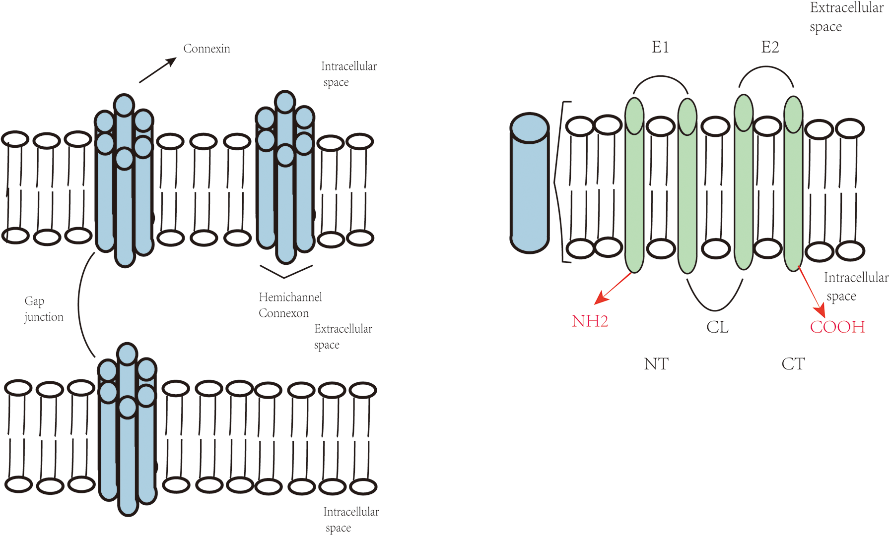 Topological structure of connexins and composition of gap junctions and hemichannels.