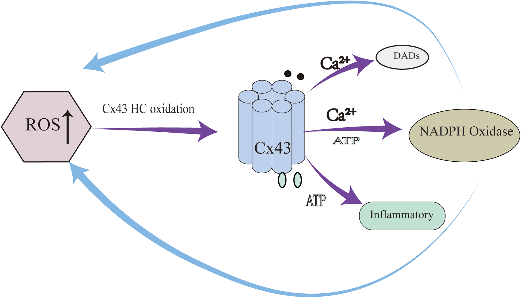 ROS–hemichannel positive feedback loop plays a critical role in arrhythmogenesis.