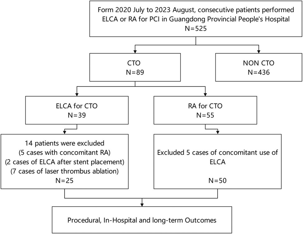 Notably, direct comparisons between ELCA and RA in CTO-PCI are scarce in China. This study therefore aims to evaluate and compare procedural success rates, complications, and the incidence of major adverse cardiovascular and cerebrovascular events (MACCE) during follow-up between ELCA and RA for CTO treatment, providing critical insights for contemporary practice.