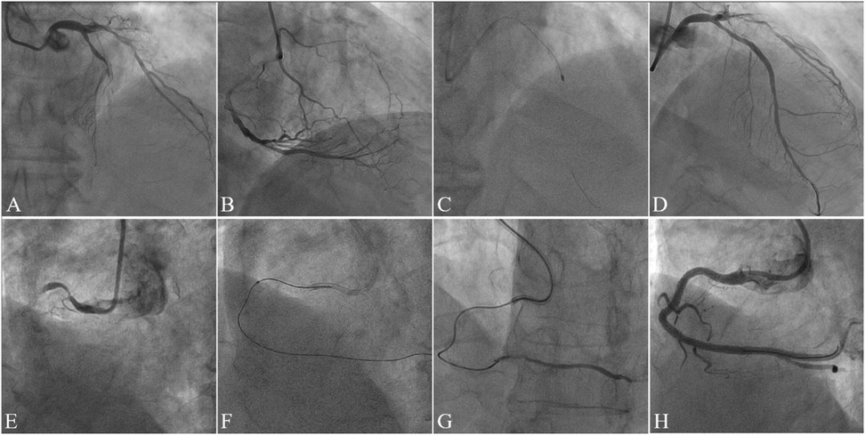 Figure 2. Case illustrations of CTO-PCI with rotational atherectomy (RA) and excimer laser coronary atherectomy (ELCA). Case 1. (A) Preprocedural angiography demonstrating mid-to-distal left anterior descending artery (LAD) occlusion (TIMI 0 flow); (B) Right coronary artery (RCA) angiography showing collateral circulation supplying the distal LAD; (C) Rotational atherectomy (RA) performed after failed antegrade wiring and balloon uncrossability; (D) Final angiography post-stenting demonstrating restored patency (TIMI 3 flow). Case 2. (E) Preprocedural angiography revealing proximal RCA occlusion (TIMI 0 flow); (F) Excimer laser coronary atherectomy (ELCA) initiated after failed antegrade microcatheter advancement; (G) Post-ELCA microcatheter advancement to the distal RCA true lumen (confirmed by contrast injection); (H) Final angiography post-stenting showing optimal vessel reconstruction.