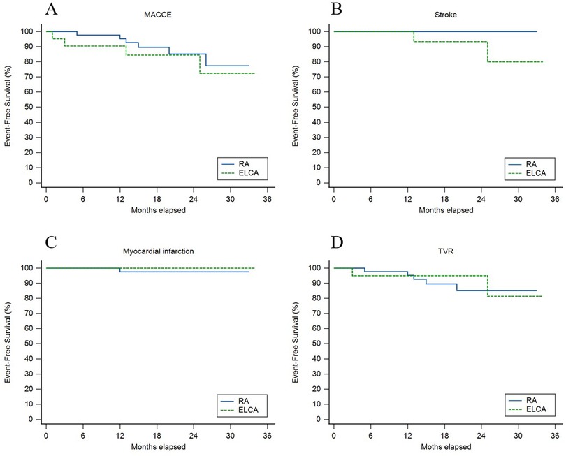 Figure 3. Unadjusted kaplan–meier curves for (A) major adverse cardiovascular and cerebrovascular events (MACCE), (B) stroke, (C) myocardial infarction, and (D) target vessel revascularization (TVR) between ELCA and RA groups.