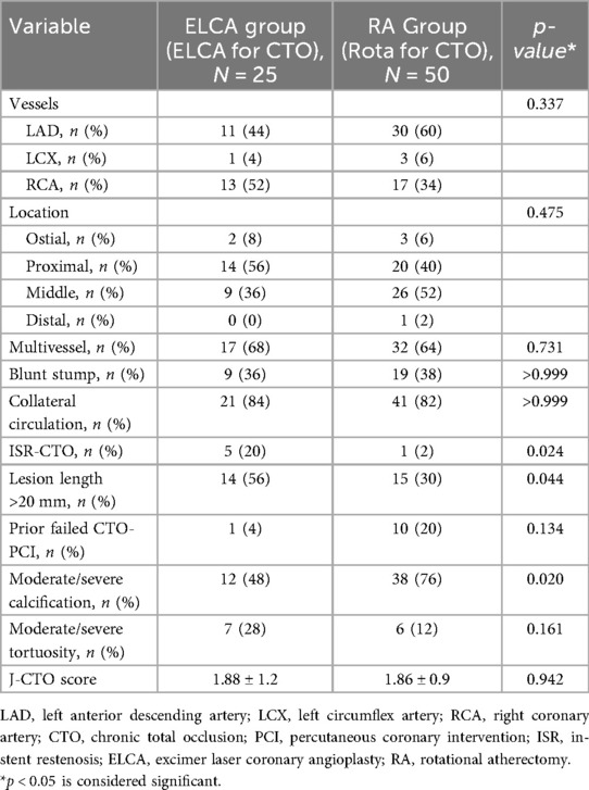 Seventy-five consecutive patients undergoing PCI for CTO were treated with either ELCA (n = 25) or RA (n = 50). Baseline characteristics were well-balanced between groups (Table 1), with no significant differences in mean age (ELCA: 64.76 ± 9.42 vs. RA: 67.22 ± 8.58 years), comorbidities (hypertension: 68% vs. 72%; dyslipidemia: 52% vs. 58%; diabetes mellitus: 36% vs. 2%), smoking status (28% vs. 34%), or prior revascularization [PCI: 24% vs. 30%; coronary artery bypass grafting (CABG): 8% vs. 6%] (all p > 0.05). Serum creatinine (1.12 ± 0.31 vs. 1.08 ± 0.28 mg/dl) and left ventricular ejection fraction (LVEF) (52.4 ± 8.7% vs. 53.1 ± 9.2%) were also comparable.