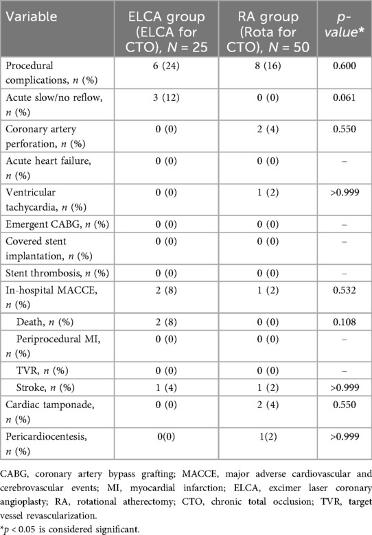 In CTO-PCI, balloon uncrossable and undilatable lesions are challenging, accounting for 9% and 2% of failures, respectively, often due to severe calcification or poor plaque compliance (14). Both RA and ELCA are widely used to address these issues, with RA being the primary tool for debulking calcified lesions, whereas ELCA is particularly efficacious in treating device-uncrossable CTO lesions. However, each technique has distinct complication profiles: The higher incidence of transient slow/no-reflow with ELCA (12% vs. 0%, p = 0.061) may be partially attributable to its photomechanical mechanism: ultraviolet laser-induced acoustic waves fragment plaque into microparticles, with inadequate saline flushing potentially contributing to microvascular embolization (15), while RA incurred two perforations (4%) potentially attributable to severe calcification (76% vs. 48% in ELCA). Our RA outcomes align with Safian et al.'s evidence that smaller burrs (1.25–1.50 mm in 98% of cases) reduce vascular complications vs. larger burrs (5.1% vs. 12.7%, p < 0.05) (16). Although no risk stratification using the Thrombolysis in Myocardial Infarction Risk Score for Secondary Prevention (TRS 2°P) was performed (17), all patients received standardized post-procedural dual antiplatelet therapy (DAPT), and Both techniques achieved benchmark success rates (RA 96% vs. ELCA 88%), consistent with Juan et al.'s multicenter ELCA data (91% overall success) (18) and French registry RA outcomes (19). These findings validate lesion-specific utility—RA for calcified niches, ELCA for ISR-CTO/long lesions requiring wire preservation—while emphasizing proactive risk mitigation (saline flushing for ELCA, burr-size optimization for RA) (20, 21). In clinical practice, selecting the appropriate technique based on lesion characteristics and optimizing procedural strategies can enhance procedural safety and efficacy.