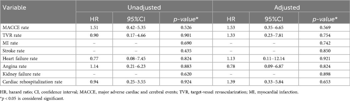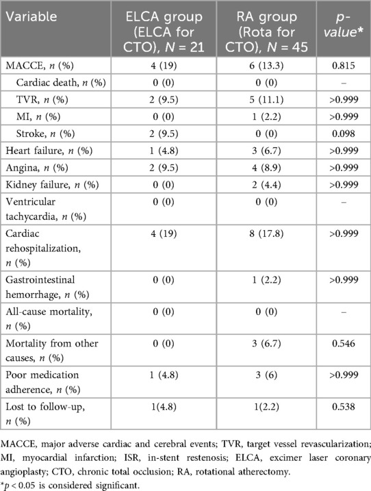 During a median follow-up of 17.5 months, both ELCA and RA demonstrated comparable rates of TVR (9.5% vs. 11.1%, p = 0.754) and MACCE (19% vs. 13.3%, p = 0.569), with no cardiac deaths observed. These findings align with Ojeda et al.'s multicenter ELCA study (TVR 11.9% at 14 months) (26), confirming the long-term safety of both techniques. Notably, two stroke events occurred in the ELCA group (9.5% vs. 0%, p = 0.098): one lacunar infarction in a noncompliant smoker at 2 months post-PCI, and one brainstem infarction at 25 months without residual deficits. Both cases were adjudicated as unrelated to the procedure, consistent with prior ELCA studies showing no increased late stroke risk (27). Cox regression adjusting for key anatomical and metabolic confounders (moderate/severe calcification, lesion length >20 mm, ISR-CTO, diabetes mellitus) revealed no MACCE difference between ELCA and RA (adjusted HR 1.53, 95% CI 0.35–6.65, p = 0.569), mirroring independent reports that neither RA nor ELCA independently elevate MACCE risk (28, 29).