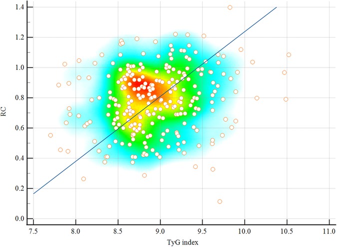 Figure 4. Scatter plot showing the Pearson correlation between the TyG index and RC in patients with CAD (r = 0.183, P = 0.006). A weak but statistically significant positive association was observed. Scatter plots are overlaid with density heatmaps, with linear regression lines shown. The color gradient from blue to red indicates increasing point density. TyG, triglyceride-glucose index; RC, remnant cholesterol; CAD, coronary artery disease.
