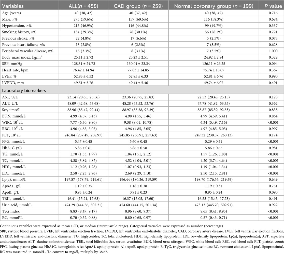 A total of 458 young adults (age ≤45 years) were enrolled in the study, including 259 patients diagnosed with CAD group and 199 individuals with angiographically normal coronary arteries (normal coronary group). All angiographic images were independently interpreted by two experienced interventional cardiologists (X.W. and L.W.), both blinded to patients’ clinical and laboratory information. Agreement between observers and within the same observer for lesion categorization was excellent, with Cohen's κ coefficients of 0.90 and 0.93, respectively. The baseline demographic and clinical characteristics of the two groups are summarized in Table 1.