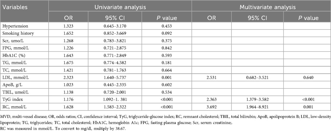 In the multivariate regression model adjusting for potential confounders (Table 4), both TyG index and RC remained independent predictors of MVD. The TyG index demonstrated a strong association with the risk of multi-vessel disease (OR: 2.363, 95% CI: 1.379–3.582, P < 0.001), while RC showed an even stronger predictive power (OR: 3.692, 95% CI: 1.964–8.921, P = 0.001). Interestingly, LDL-C, although significant in univariate analysis, lost statistical significance in the multivariate model (OR: 2.531, 95% CI: 0.682–3.521, P = 0.640), indicating its inferior predictive value compared to RC and TyG.