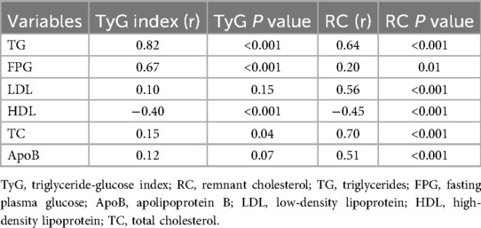 As shown in Table 5, the TyG index was strongly correlated with TG (r = 0.82, P < 0.001) and FPG (r = 0.67, P < 0.001), and showed a moderate negative correlation with HDL-C (r = –0.40, P < 0.001). RC was moderately to strongly correlated with TG (r = 0.64, P < 0.001), TC (r = 0.70, P < 0.001), LDL-C (r = 0.56, P < 0.001), and ApoB (r = 0.51, P < 0.001), and negatively correlated with HDL-C (r = –0.45, P < 0.001). These findings indicate that while TyG primarily reflects glucose–lipid dysregulation, RC is more closely linked to cholesterol-rich lipoproteins.