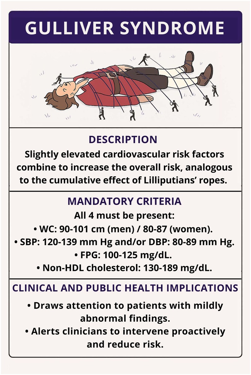 The Gulliver syndrome is characterized by the simultaneous presence of at least four mildly abnormal CVRFs, each falling within a “borderline” range but together elevating total cardiovascular risk.